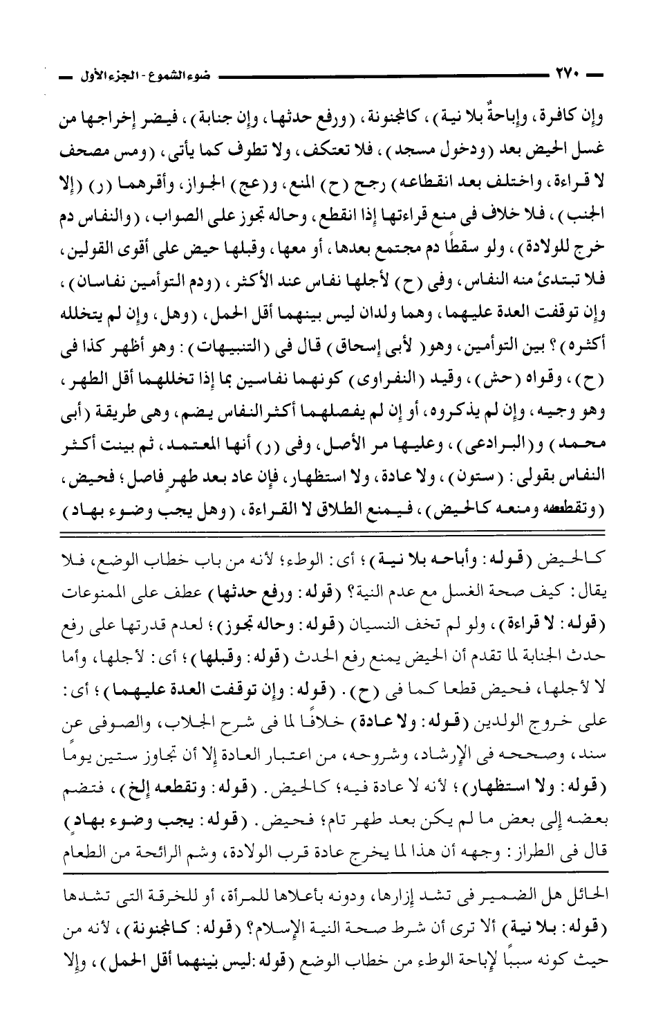 وإن كافرة، وإباحةُ بلا نية)، كالمجنونة، (ورفع حدثها، وإن جنابة)، فيضر إخراجها من غسل الحيض بعد (ودخول مسجد)، فلا تعتكف، ولا تطوف كما يأتي، (ومس مصحف لا قراءة، واختلف بعد انقطاعه) رجح (ح) المنع، و (عج) الجواز، وأقرهما (ر) (إلا الجنب)، فلا خلاف في منع قراءتها إذا انقطع، وحاله تجوز على الصواب، (والنفاس دم خرج للولادة)، ولو سقطًا دم مجتمع بعدها، أو معها، وقبلها حيض على أقوى القولين، فلا تبتدئ منه النفاس، وفي (ح) لأجلها نفاس عند الأكثر، (ودم التوأمين نفاسان)، وإن توقفت العدة عليهما، وهما ولدان ليس بينهما أقل الحمل، (وهل، وإن لم يتخلله أكثره)؟ بين التوأمين، وهو (لأبي إسحاق) قال في (التنبيهات): وهو أظهر كذا في (ح)، وقواه (حش)، وقيد (النفراوي) كونهما نفاسين بما إذا تخللهما اقل الطهر، وهو وجيه، وإن لم يذكروه، أو إن لم يفصلهما أكثر النفاس يضم، وهي طريقة (أبي محمد) و (البرادعي)، وعليها مر الأصل، وفي (ر) أنها المعتمد، ثم بينت أكثر النفاس بقولي: (ستون)، ولا عادة، ولا استظهار، فإن عاد بعد طهرٍ فاصل؛ فحيض، (وتقطعه ومنعه كالحيض)، فيمنع الطلاق لا القراءة، (وهل يجب وضوء بهاد)