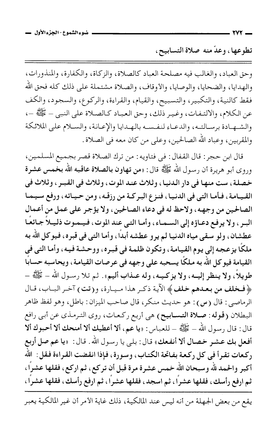 قال ابن حجر: قال القفال: في فتاويه: من ترك الصلاة قصر بجميع المسلمين، وروى أبو هريرة أن رسول الله صلى الله عليه وسلم قال: "من تهاون بالصلاة عاقبه الله بخمس عشرة خصلة، ست منها في دار الدنيا، وثلاث عند الموت، وثلاث في القبر، وثلاث في القيامة، فأما التي في الدنيا، فنزع البركة من رزقه، ومن حياته، ورفع سيما الصالحين من وجهه، ولا حظ له في دعاء الصالحين، ولا يؤجر على عمل من أعمال البر، ولا يرفع دعاؤه إلى السماء، وأما التي عند الموت، فيموت ذليلًا جائعًا عطشان، ولو سقي مياه الدنيا لم يرو عطشه أبدًا، وأما التي في قبره، فيوكل الله به ملكًا يزعجه إلى يوم القيامة، وتكون ظلمة في قبره، ووحشة فيه، وأما التي في القيامة فيوكل الله به ملكًا يسحبه على وجهه في عرصات القيامة، ويحاسبه حسابًا طويلًا، ولا ينظر إليه، ولا يزكيه، وله عذاب أليم". ثم تلا رسول الله- صلى الله عليه وسلم- {فخلف من بعدهم خلف} الآية ذكر هذا ميارة، و (تت) آخر الباب، قال الرماصي: قال (س): هو حديث منكر، قال صاحب الميزان: باطل، وهو لفظ ظاهر البطلان (قوله: صلاة التسابيح) هي أربع ركعات، روى الترمذي عن أبي رافع قال: قال رسول الله- صلى الله عليه وسلم- للعباس: "يا عم، ألا أعطيك ألا أمنحك ألا أحبوك ألا أفعل بك عشر خصال ألا أنفعك" قال: بلى يا رسول الله قال: "يا عم صل أربع ركعات تقرأ في كل ركعة بفاتحة الكتاب، وسورة، فإذا انقضت القراءة فقل: الله أكبر والحمد لله وسبحان الله خمس عشرة مرة قبل أن تركع، ثم اركع، فقلها عشرًا، ثم ارفع رأسك، فقلها عشرًا، ثم اسجد، فقلها عشرًا، ثم ارفع رأسك، فقلها عشرًا،