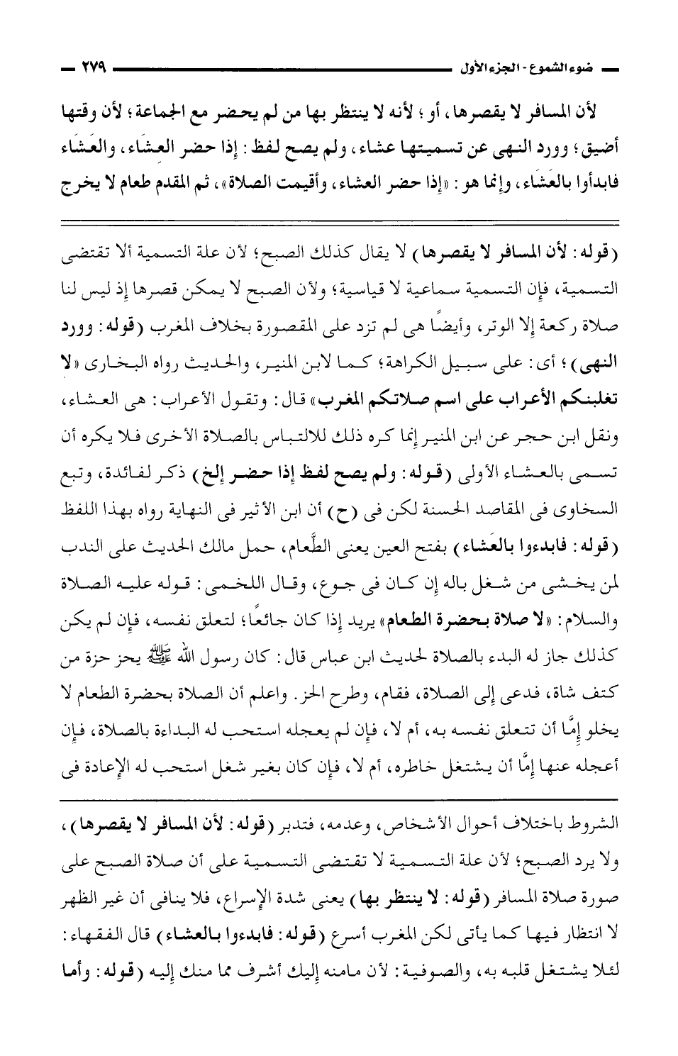 الشروط باختلاف أحوال الأشخاص، وعدمه، فتدبر (قوله: لأن المسافر لا يقصرها)، ولا يرد الصبح؛ لأن علة التسمية لا تقتضي التسمية على أن صلاة الصبح على صورة صلاة المسافر (قوله: لا ينتظر بها) يعني شدة الإسراع، فلا ينافي أن غير الظهر لا انتظار فيها كما يأتي لكن المغرب أسرع (قوله: فابدءوا بالعشاء) قال الفقهاء: لئلا يشتغل قلبه به، والصوفية: لأن ما منه إليك أشرف مما منك إليه (قوله: وأما