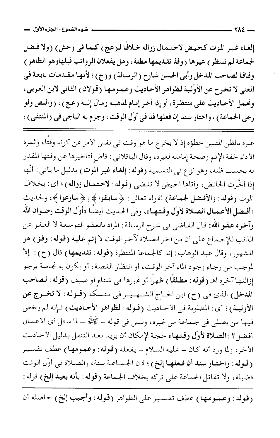 عبرة بالظن المتبين خطؤه إذ لا يخرج ما هو وقت في نفس الأمر عن كونه وقتًا، وثمرة الأداء خفة الإثم وصحة إمامته لغيره، وقال الباقلاني: قاض لتأخيرها عن وقتها المقدر له بحسب ظنه، وهو نزاع في التسمية (قوله: إلغاء غير الموت) بدليل ما يأتي: أنَّها إذا أخَّرت الحائض، وأتاها الحيض لا تقضي (قوله: لاحتمال زواله)؛ أي: بخلاف الموت (قوله: والأفضل لجماعة) لقوله تعالى: {سابقوا} و {سارعوا}، والحديث "أفضل الأعمال الصلاة لأوّل وقتها"، وفي الحديث أيضًا "أول الوقت رضوان الله وآخره عفو الله" قال القاضي في شرح الرسالة: المراد بالعفو التوسعة لا العفو عن الذنب للإجماع على أن من أخر الصلاة لآخر الوقت لا إثم عليه (قوله: وفز) هو المشهور، وقال عبد الوهاب: إنه كالجماعة المنتظرة (قوله: تقديمها) قال (ح): إلا لموجب من رجاء وجود الماء آخر الوقت، أو انتظار القصة، أو يكون به نجاسة يرجو إزالتها آخره اهـ (قوله: مطلقًا) ظهرًا أو غيرها في شتاء أو صيف (قوله: لصاحب المدخل) الذي في (ح) ابن الحاج الشهير في منسكه (قوله: لا تخرج عن الأولية)؛ أي: المطلوبة في الأحاديث (قوله: لظواهر الأحاديث) فإنه لم يخص فيها من يصلي في جماعة من غيره، وليس في قوله -صلى الله عليه وسلم- لما سئل أي الأعمال أفضل؟ "الصلاة لأوّل وقتها" حجة لإمكان أن يزيد بعد التنفل بدليل الأحاديث الأخر، ولما ورد أنه كان -عليه السلام- يفعله (قوله: وعمومها) عطف تفسير (قوله: واختار سند أن فعلها إلخ)؛ لأن الجماعة سنة، والصلاة في أوّل الوقت فضيلة، ولا تقاتل الجماعة على تركة بخلاف الجماعة (قوله: بأنه يعيد إلخ) قوله