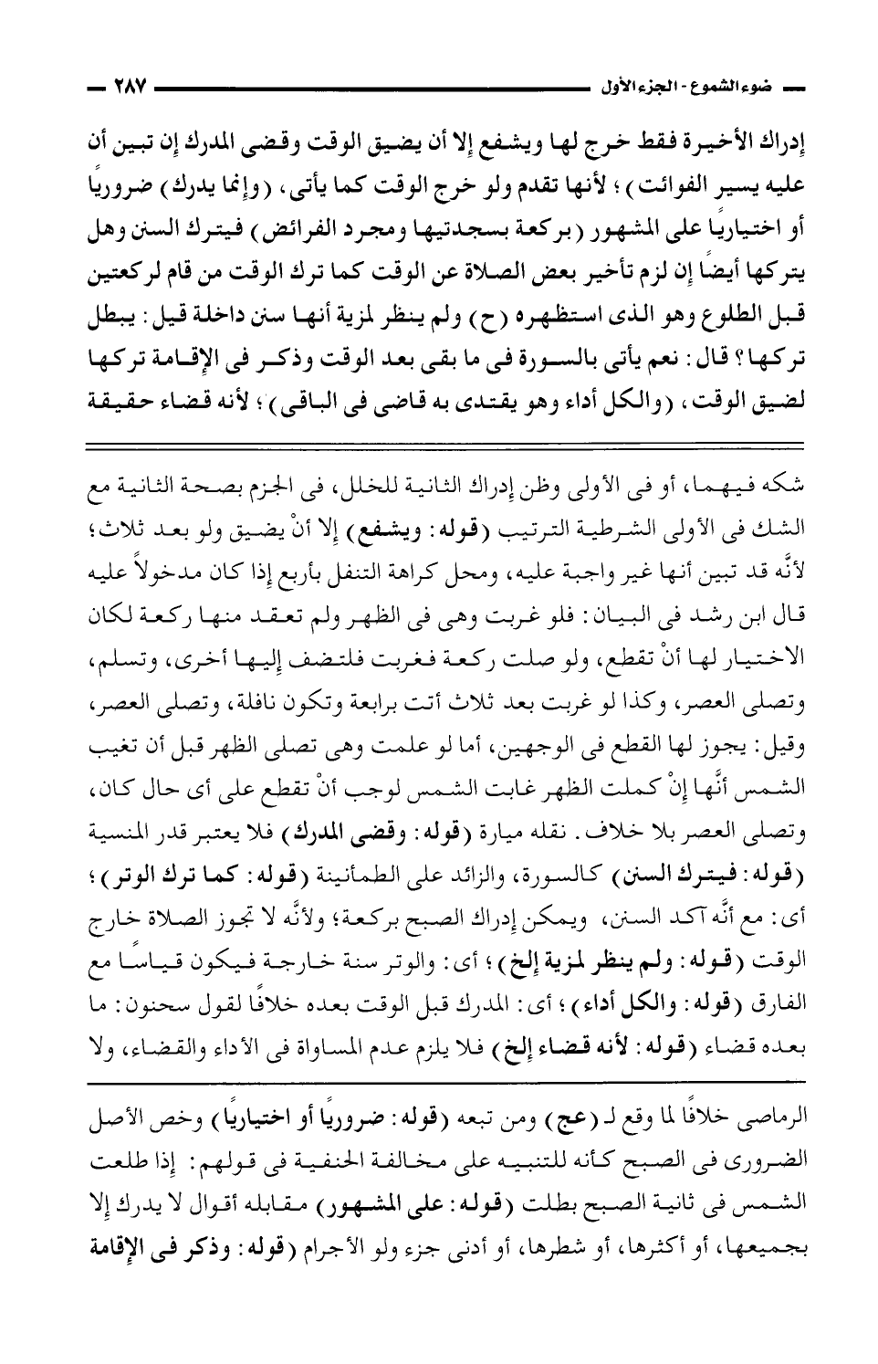 إدراك الأخير فقط خرج لها ويشفع إلا أن يضيق الوقت وقضى المدرك إن تبين أن عليه يسير الفوائت)؛ لأنها تقدم ولو خرج الوقت كما يأت، (وإنما يدرك) ضروريا أو اختياريا على المشهور (بركعة بسجدتيها ومجرد الفرائض) فيترك السنن وهل يتركها أيضا إن لزم تأخير بعض الصلاة عن الوقت كما ترك الوقت من قام لركعتين قبل الطلوع وهو الذي استظهره (ح) ولم ينظر لمزية أنها سنن داخلة قيل: يبطل بركها؟ قال: نعم يأتي بالسورة في ما بقى بعد الوقت وذكر في الإقامة تركها لضيق الوقت، (والكل أداء وهو يقتدي به قاضى في الباقي)؛ لأنها قضاء حقيقة