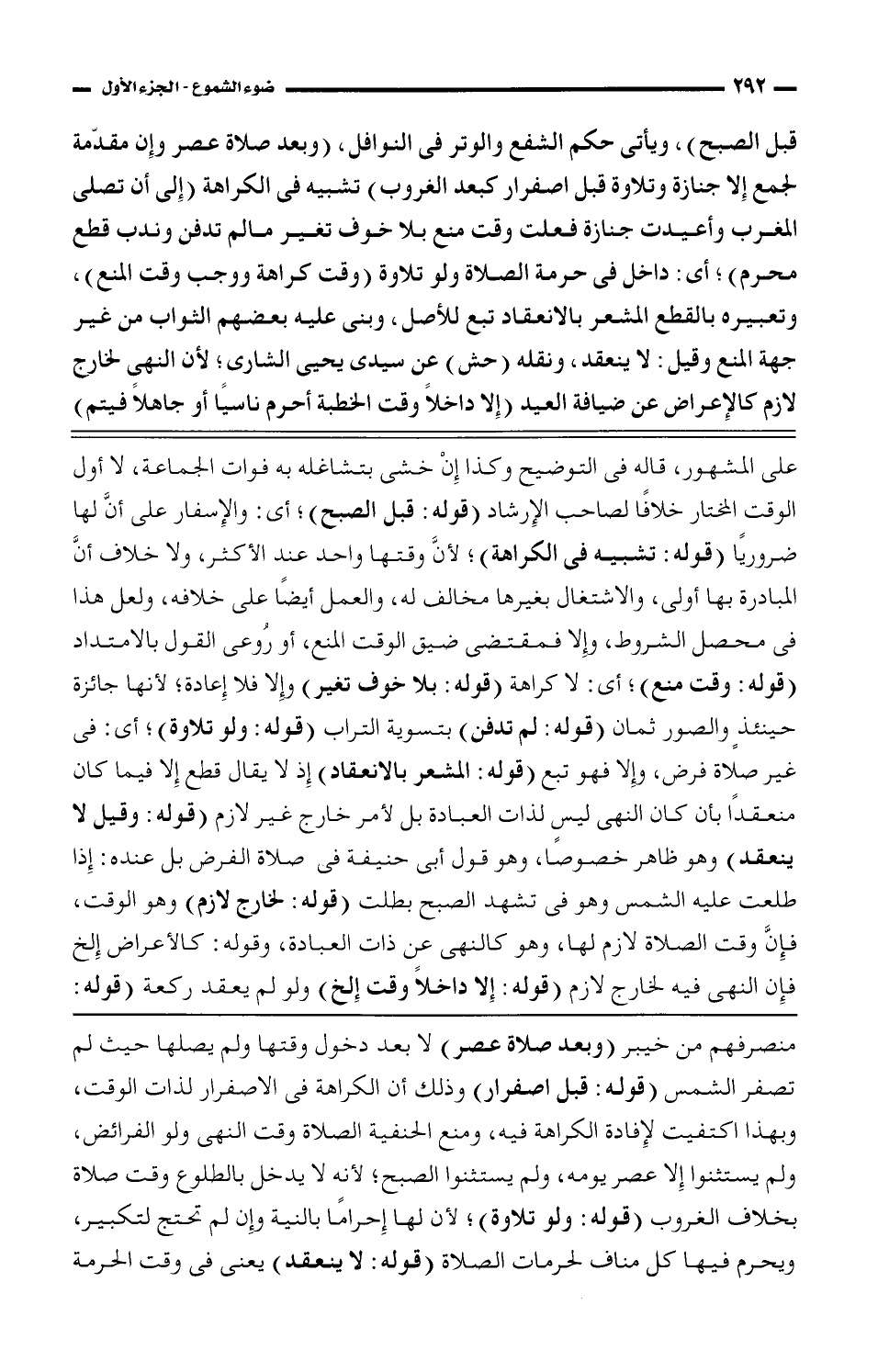 منصرفهم من خيبر (وبعد صلاة عصر) لا بعد دخول وقتها ولم يصلها حيث لم تصفر الشمس (قوله: قبل اصفرار) وذلك أن الكراهة في الاصفرار لذات الوقت، وبهذا اكتفيت لإفادة الكراهة فيه، ومنع الحنفية الصلاة وقت النهي ولو الفرائض، ولم يستثنوا إلا عصر يومه، ولم يستثنوا الصبح؛ لأنه لا يدخل بالطلوع وقت صلاة بخلاف الغروب (قوله: ولو تلاوة)؛ لأن لها إحرامًا بالنية وإن لم تحتج لتكبير، ويحرم فيها كل مناف لحرمات الصلاة (قوله: لا ينعقد) يعني في وقت الحرمة