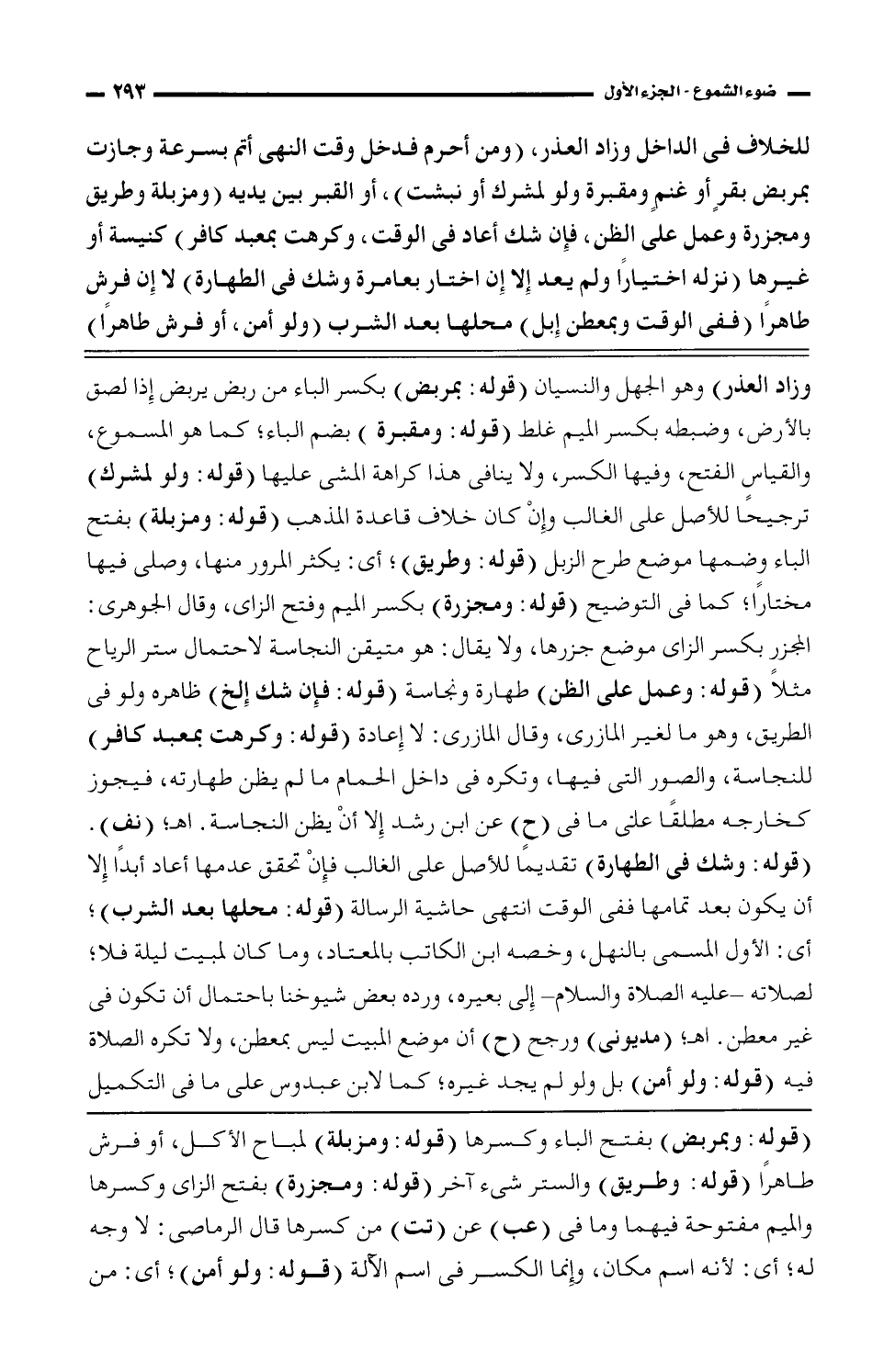 للخلاف في الداخل وزاد العذر، (ومن أحرم فدخل وقت النهي أتم بسرعة وجازت بمربض بقر أو غنم ومقبرة ولو لمشرك أو نبشت)، أو القبر بين يديه (ومزبلة وطريق ومجزرة وعمل على الظن، فإن شك أعاد في الوقت، وكرهت بمعبد كافر) كنيسة أو غيرها (نزله اختيارًا ولم يعد إلا إن اختار بعامرة وشك في الطهارة) لا إن فرش طاهرًا (ففي الوقت وبمعطن إبل) محلها بعد الشرب (ولو أمن، أو فرش طاهرًا)