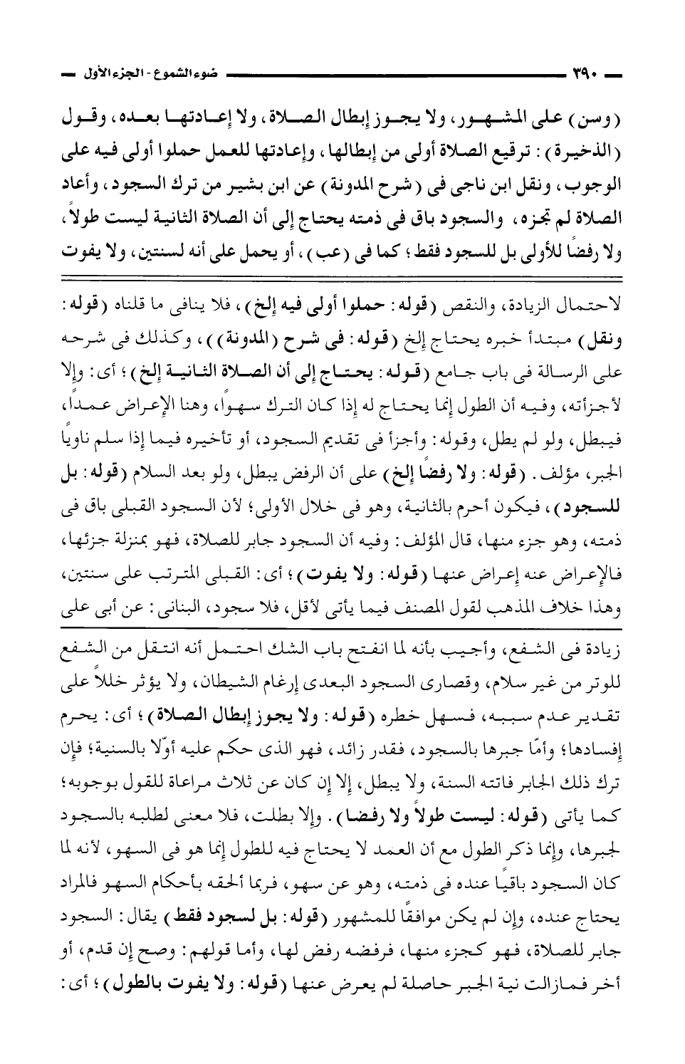 زيادة في الشفع، وأجيب بأنه لما انفتح باب الشك احتمل أنه انتقل من الشفع للوتر من غير سلام، وقصارى السجود البعدي إرغام الشيطان، ولا يؤثر خللًا على تقدير عدم سببه، فسهل خطره (قوله: ولا يجوز إبطال الصلاة)؛ أي: يحرم إفسادها؛ وأما جبرها بالسجود، فقدر زائد، فهو الذي حكم عليه أولًا بالسنية؛ فإن ترك ذلك الجابر فاتته السنة، ولا يبطل، إلا إن كان عن ثلاثة مراعاة للقول بجوبه؛ كما يأتي (قوله: ليست طولًا ولا رفضًا). وإلا بطلت، فلا معنى لطلبه بالسجود بجبرها، وإنما ذكر الطول مع أن العمد لا يحتاج فيه للطول إنما هو في السهو، لأنه لما كان السجود باقيًا عنده في ذمته، وهو عن سهو، فربما ألحقه بأحكام السهو فالمراد يحتاج عنده، وإن لم يكن موافقًا للمشهور (قوله: بل لسجود فقط) يقال: السجود جابر للصلاة، فهو كجزء منها، فرفضه رفض لها، وأما قولهم: وصح إن قدم، أو أخر فمازالت نية الجبر حاصلة لم يعرض عنها (قوله: ولا يفوت بالطول)؛ أي:
