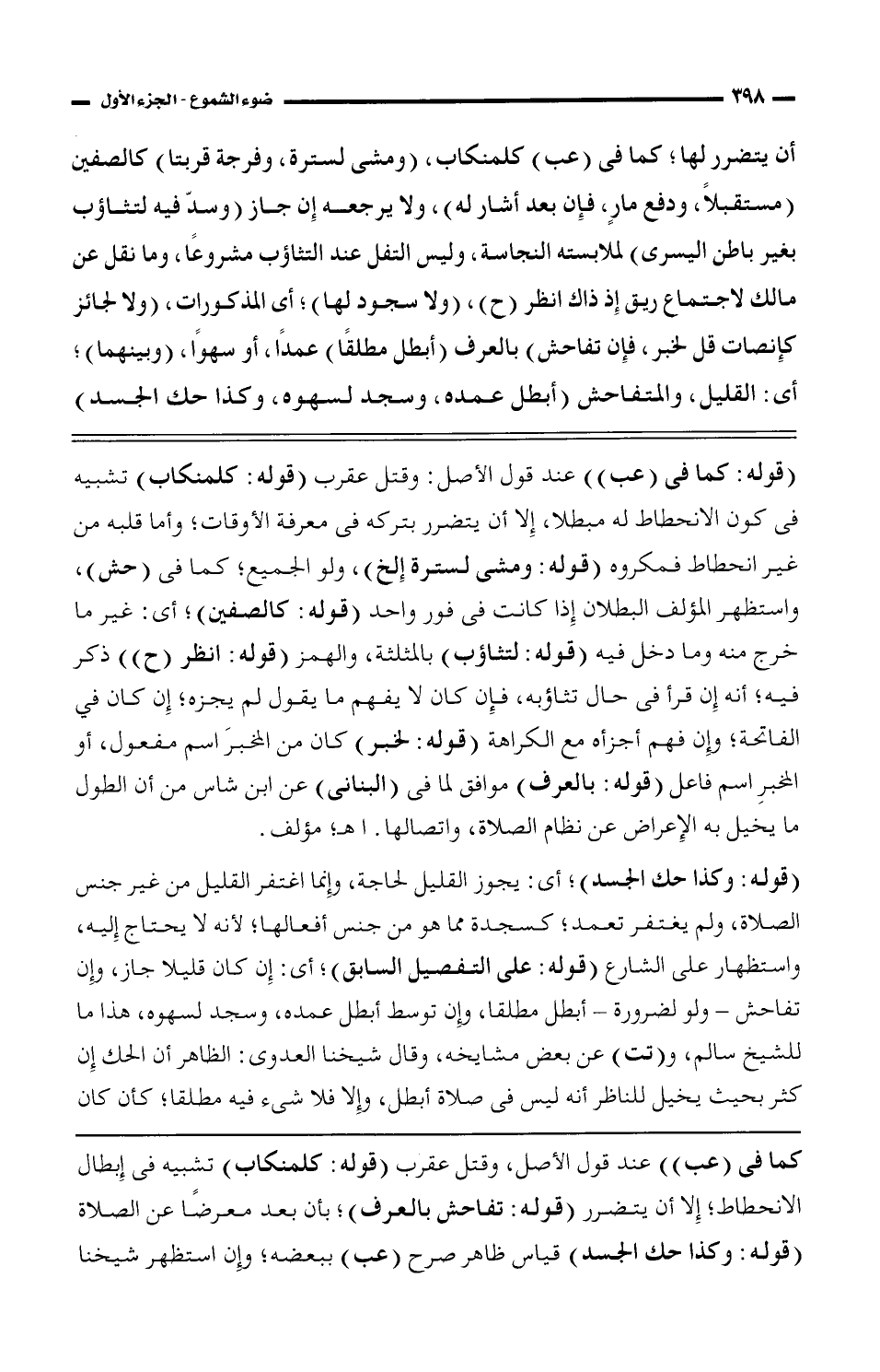 كما في (عب)) عند قول الأصل، وقتل عقرب (قوله: كلمنكاب) تشبيه في إبطال الانحطاط؛ إلا أن يتضرر (قوله: تفاحش بالعرف)؛ بأن بعد معرضًا عن الصلاة (قوله: وكذا حك الجسد) قياس ظاهر صرح (عب) ببعضه؛ وإن استظهر شيخنا
