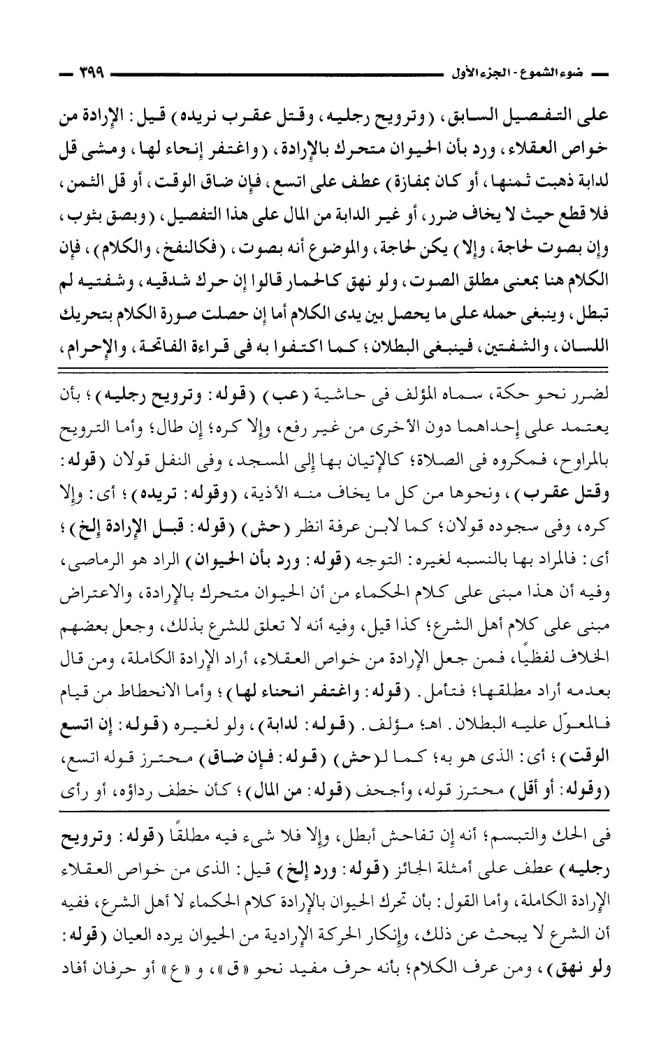 في الحك والتبسم؛ أنه إن تفاحش أبطل، وإلا فلا شيء فيه مطلقًا (قوله: وترويح رجليه) عطف على أمثلة الجائز (قوله: ورد إلخ) قيل: الذي من خواص العقلاء الإرادة الكاملة، وأما القول: بأن تحرك الحيوان بالإرادة كلام الحكماء لا أهل الشرع، ففيه أن الشرع لا يبحث عن ذلك، وإنكار الحركة الإرادية من الحيوان يرده العيان (قوله: ولو نهق)، ومن عرف الكلام؛ بأنه حرف مفيد نحو "ق"، و "ع" أو حرفان أفاد