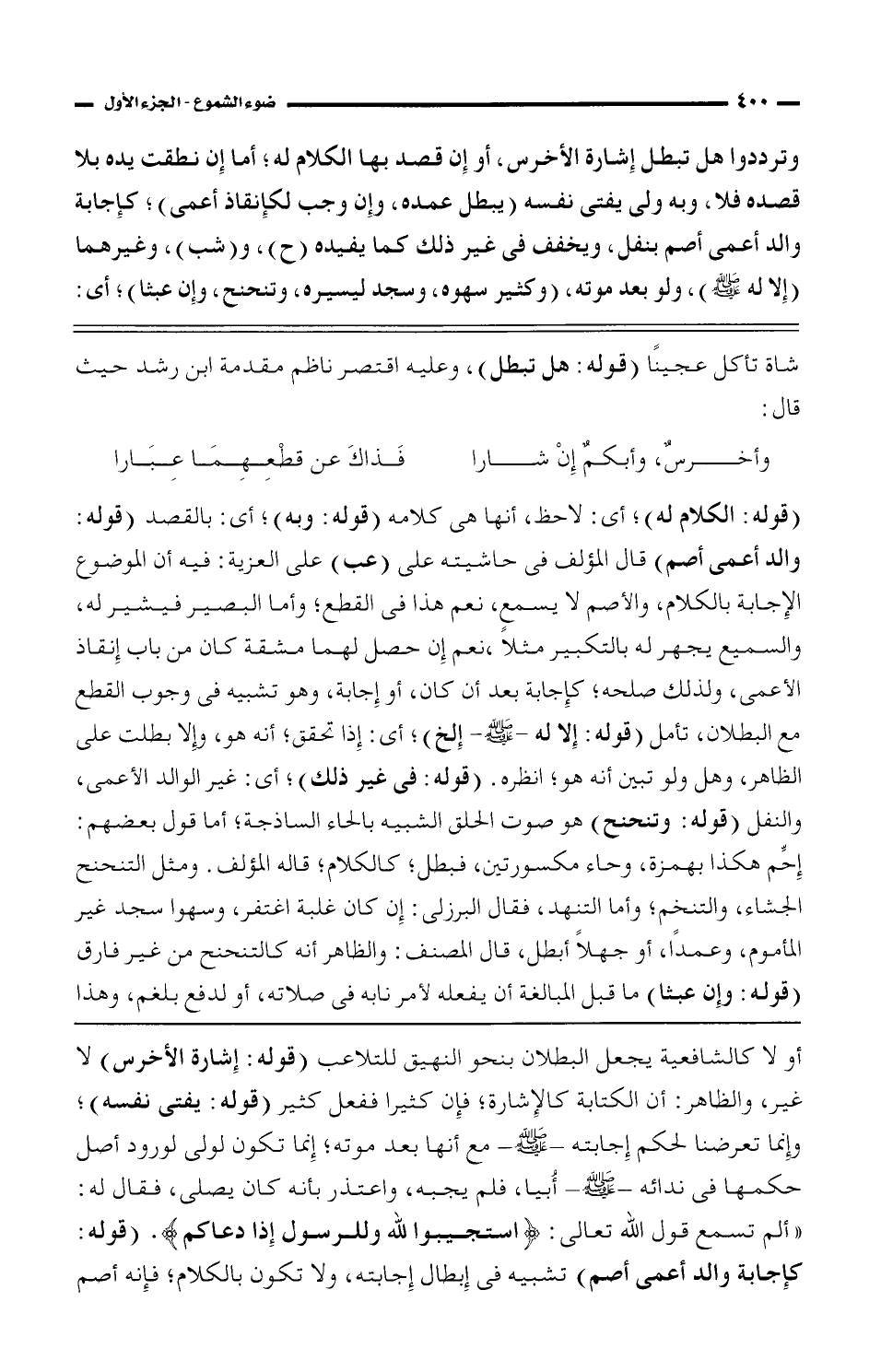 وترددوا هل تبطل إشارة الأخرس، أو إن قصد بها الكلام له؛ أما إن نطقت يده بلا قصده فلا، وبه ولى يفتى نفسه (يبطل عمده، وإن وجب لكإنقاذ أعمى)؛ كإجابة والد أعمى أصم بنفل، ويخفف في غير ذلك كما يفيده (ح)، و (شب)، وغيرهما (إلا له صلى الله عليه وسلم)، ولو بعد موته، (وكثير سهوه، وسجد ليسيره، وتنحنح، وإن عبثا)؛ أي: