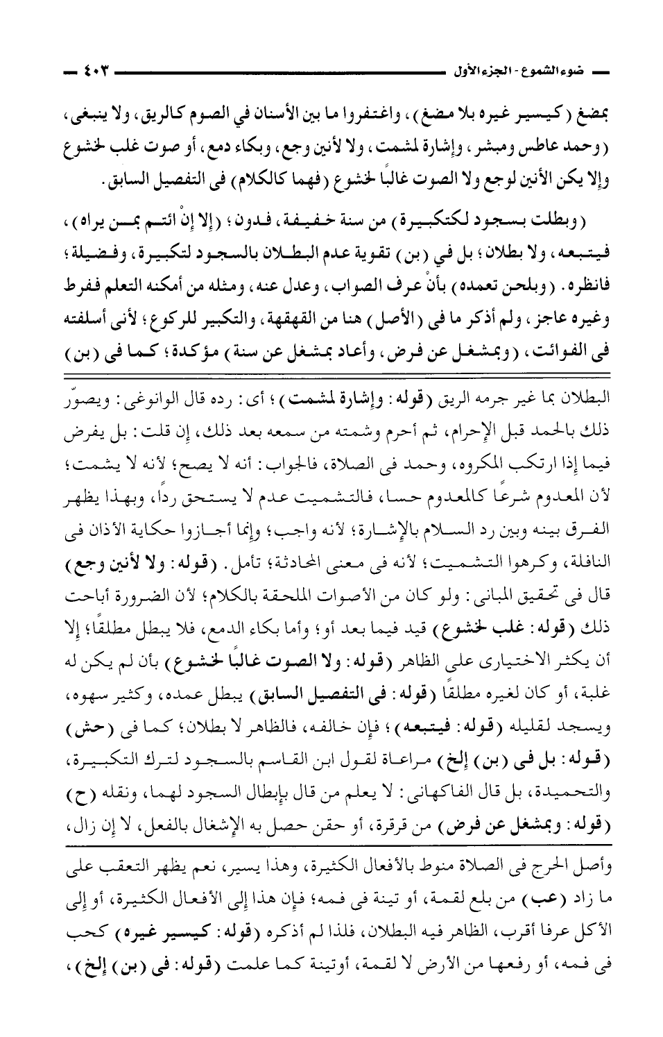 البطلان بما غير جرمه الريق (قوله: وإشارة لمشمت)؛ أي: رده قال الوانوغي: ويصور ذلك بالحمد قبل الإحرام، ثم أحرم وشمته من سمعه بعد ذلك، إن قلت: بل يفرض فيما إذا ارتكب المكروه، وحمد في الصلاة، فالجواب: أنه لا يصح؛ لأنه لا يشمت؛ لأن المعدوم شرعًا كالمعدوم حسًا، فالتشميت عدم لا يستحق ردًا، وبهذا يظهر الفرق بينه وبين رد السلام بالإشارة؛ لأنه واجب؛ وإنما أجازوا حكاية الأذان في النافلة، وكرهوا التشميت؛ لأنه في معنى المحادثة؛ تأمل. (قوله: ولا لأنين وجع) قال في تحقيق المباني: ولو كان من الأصوات الملحقة بالكلام؛ لأن الضرورة أباحت ذلك (قوله: غلب لخشوع) قيد فيما بعد أو؛ وأما بكاء الدمع، فلا يبطل مطلقًا؛ إلا أن يكثر الاختياري على الظاهر (قوله: ولا الصوت غالبًا لخشوع) بأن لم يكن له غلبة، أو كان لغيره مطلقًا (قوله: في التفصيل السابق) يبطل عمده، وكثير سهوه، ويسجد لقليله (قوله: فيتبعه)؛ فإن خالفه، فالظاهر لا بطلان؛ كما في (حش) (قوله: بل في (بن) إلخ) مراعاة لقول ابن القاسم بالسجود لترك التكبيرة، والتحميدة، بل قال الفاكهاني: لا يعلم من قال بإبطال السجود لهما، ونقله (ح) (قوله: وبمشغل عن فرض) من قرقرة، أو حقن حصل به الإشغال بالفعل، لا إن زال،