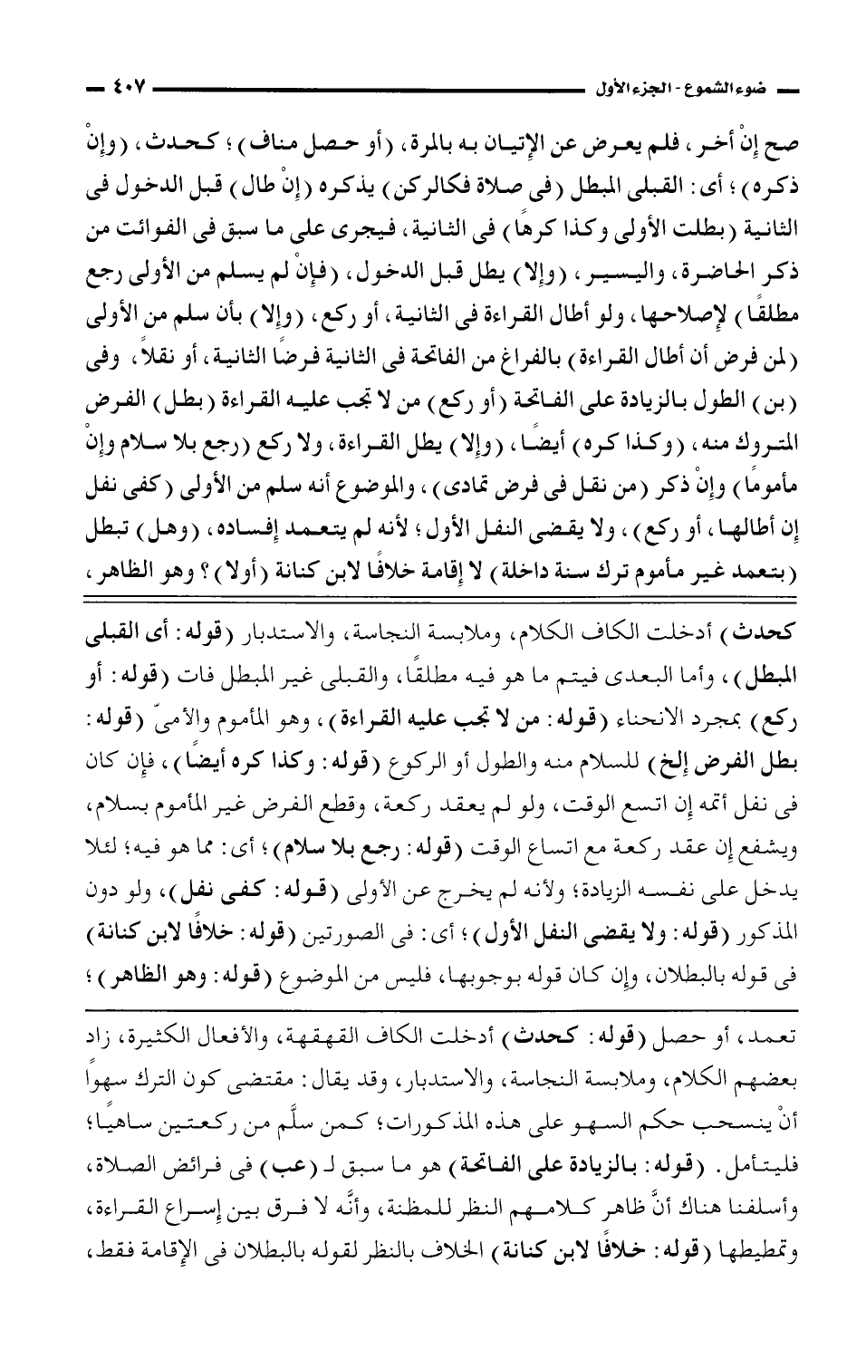 كحدث) أدخلت الكاف لكلام، وملابسة النجاسة، والاستدبار (قوله: أي القبل المبطل)، وأما البعدي فيتم ما هو فيه مطلقًا، والقبلى غير المبطل فات (قوله: أو ركع) بمجرد الانحناء (قوله: من لا تجب عليه القراءة)، وهو المأموم والأمى (قوله: بطل الفرض إلخ) للسلام منه والطول أو الركوع (قوله: وكذا كره أيضًا)، فإن كان في نفل أتمه إن اتسع الوقت، ولو لم يعقد ركعة، وقطع الفرض غير المأموم بسلام، ويشفع إن عقد ركعة مع اتساع الوقت (قوله: رجع بلا سلام)؛ أي: مما هو فيه؛ لئلا يدخل على نفسه الزيادة؛ ولأنه لم يخرج عن الأولى (قوله: كفى نفل)، ولو دون المذكور (قوله: ولا يقضي النفل الأول)؛ أي: في الصورتين (قوله: خلافًا لابن كنانة) في قوله بالبطلان، وإن كان قوله بوجوبها، فليس من الموضوع (قوله: وهو الظاهر)؛