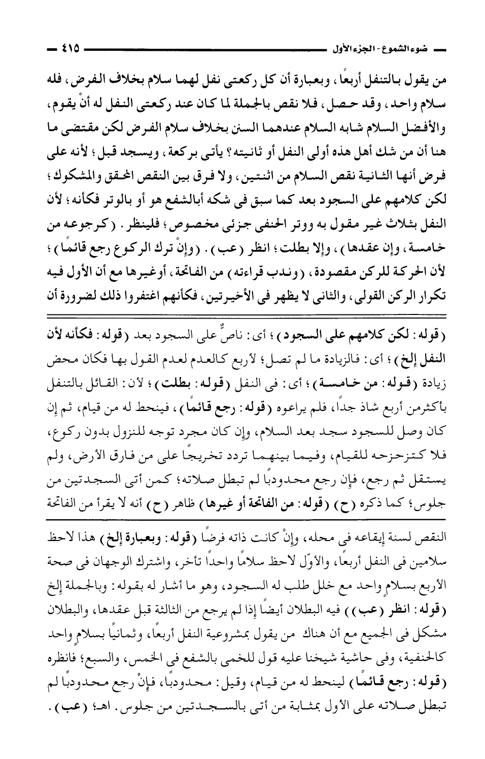 من يقول بالتنفل أربعًا، وبعبارة أن كل ركعتى نفل لهما سلام بخلاف الفرض، فله سلام واحد، وقد حصل، فلا نقص بالجملة لما كان عند ركعتى النفل له أن يقوم، والأفضل السلام شابه السلام عندهما السنن بخلاف سلام الفرض لكن مقتضى ما هنا أن من شك أهل هذه أولى النفل أو ثانيته؟ يأتى بركعة، ويسجد قبل؛ لأنه على فرض أنها الثانية نقص السلام من اثنتين، ولا فرق بين النقص المحقق والمشكوك؛ لكن كلامهم على السجود بعد كما سبق فى شكه أبالشفع هو أو بالوتر فكأنه؛ لأن النفل بثلاث غير مقول به ووتر الحنفى جزئى مخصوص؛ فلينظر. (كرجوعه من خامسة، وإن عقدها)، وإلا بطلت؛ انظر (عب). (وإن ترك الركوع رجع قائمًا)؛ لأن الحركة للركن مقصودة، (وندب قراءته) من الفاتحة، أو غيرها مع أن الأول فيه تكرار الركن القولي، والثانى لا يظهر فى الأخيرتين، فكأنهم اغتفروا ذلك لضرورة أن