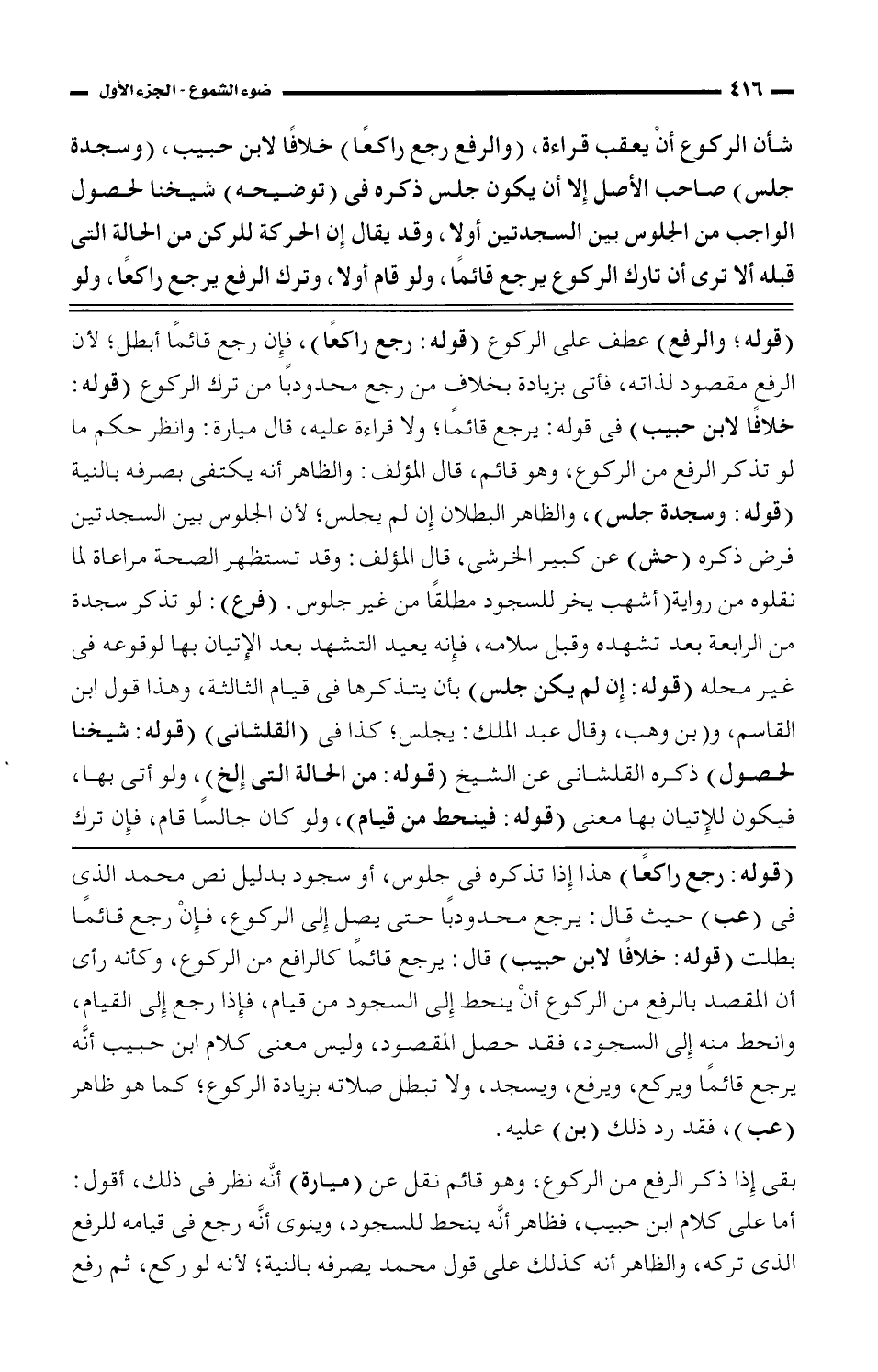 شأن الركوع أن يعقب قراءة، (والرفع رجع راكعًا) خلافًا لابن حبيب، (وسجدة جلس) صاحب الأصل إلا أن يكون جلس ذكره فى (توضيحه) شيخنا لحصول الواجب من الجلوس بين السجدتين أولا، وقد يقال إن الحركة للركن من الحالة التى قبله ألا ترى أن تارك الركوع يرجع قائمًا، ولو قام أولا، وترك الرفع يرجع راكعًا، ولو