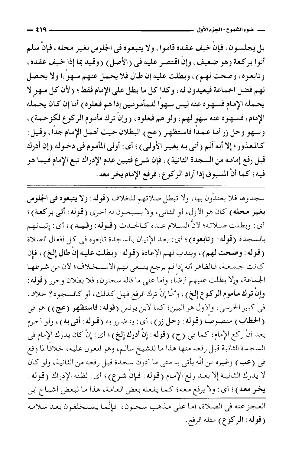 سجدوها فلا يعتدّون بها، ولا تبطل صلاتهم للخلاف (قوله: ولا يتبعوه فى الجلوس بغير محله) كان هو الأول، أو الثاني، ولا يسبحون له أخرى (قوله: أتى بركعة)؛ أي: وبطلت صلاته؛ لأنَّ السلام عنده كالحدث (قوله: وقيد)؛ أي: إتيانهم بالسجدة (قوله: وتابعوه)؛ أي: بعد الإتيان بالسجدة تابعوه فى كل أفعال الصلاة (قوله: وصحت لهم)، ويندب لهم الإعادة (قوله: وبطلت عليه إن طال إلخ)، فإن كانت جمعة، فالظاهر أنه إذا لم يرجع ينبغى لهم الاستخلاف؛ لأن من شرطها الجماعة، وإلا بطلت عليهم أيضًا، وأما على ما قاله سحنون، فلا بطلان وحرر (قوله: وإنْ ترك مأموم الركوع إلخ)، وأمَّا إن ترك الرفع فهل كذلك، أو كالسجود؟ خلاف فى كبير الخرشي، والأول هو البين؛ كما لابن يونس (قوله: فاستظهر (عج)) هو فى (الحطاب) منصوصًا (قوله: وحل زر)، أي: يتضرر به (قوله: أتى به)، ولو أحرم بعد أن ركع الإمام؛ كما فى (ح) (قوله: إنْ أدرك إلخ)، أي: إن كان يدرك الإمام فى السجدة الثانية قبل رفعه منها هذا ما للشيخ سالم، وهو المعول عليه، خلافًا لما وقع فى (عب) وغيره من أنَّه يأتى به متى ما أدرك سجدة قبل رفعه من الثانية، ولو كان لا يدرك الثانية إلا بعد رفع الإمام (قوله: فإن شرع)؛ أي: لظنه الإدراك (قوله: يخر معه)؛ أي: ولا يرفع معه؛ كما يفعله بعض العامة، هذا ما لبعض أشياخ ابن
