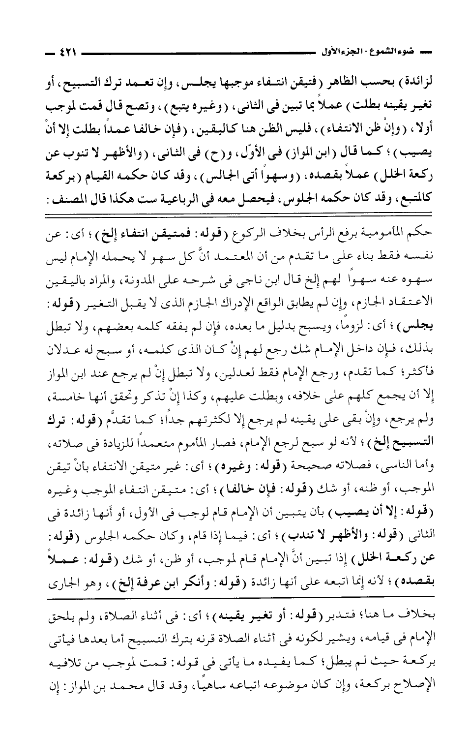 بخلاف ما هنا؛ فتدبر (قوله: أو تغير يقينه)؛ أي: فى أثناء الصلاة، ولم يلحق الإمام فى قيامه، ويشير لكونه فى أثناء الصلاة قرنه بترك التسبيح أما بعدها فيأتى بركعة حيث لم يبطل؛ كما يفيده ما يأتى فى قوله: قمت لموجب من تلافيه الإصلاح بركعة، وإن كان موضوعه اتباعه ساهيًا، وقد قال محمد بن المواز: إن
