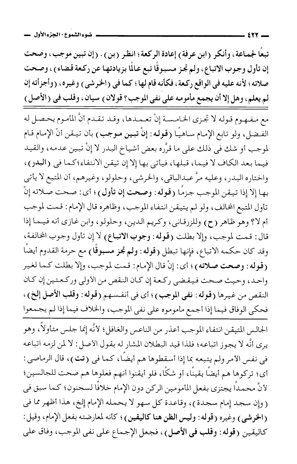 تبعًا لجماعة، وأنكر (ابن عرفة) إعادة الركعة؛ انظر (بن). (إن تبين موجب، وصحت إن تأول وجوب الاتباع، ولم تجز مسبوقًا تبع عالمًا بزيادتها عن ركعة قضاء)، وصحت صلاته؛ لأنه عليه فى الواقع ركعة، فكأنه قام لها؛ كما فى (الخرشي) وغيره، (وأجزأته إن لم يعلم، وهل إلا أن يجمع مأمومه على نفى الموجب؟ قولان) سيان، وقلب فى (الأصل)