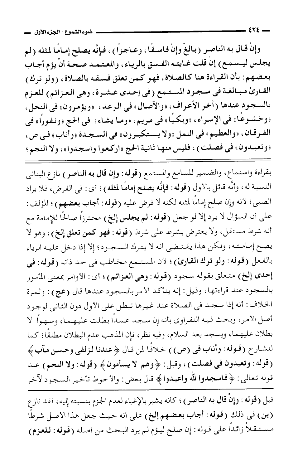 بقراءة واستماع، والضمير للسامع والمستمع (قوله: وإن قال به الناصر) نازع البنانى النسبة له، وأنّه قائل بالأول (قوله: فإنَّه يصلح إمامًا لمثله)؛ أي: فى الفرض، فلا يراد الصبي؛ لأنه وإن صلح إمامًا لمثله لكنه لا فرض عليه (قوله: أجاب بعضهم)؛ المؤلف: على أن السؤال لا يرد إلا لو جعل (قوله: لم يجلس إلخ) محترزًا صالحًا للإمامة مع أنه شرط مستقل، ولا يعترض بشرط على شرط (قوله: فهو كمن تعلق إلخ)، وهو لا يصح إمامته، ولكن هذا يقتضى أنه لا يترك السجود؛ إلا إذا دخل عليه الرياء بالفعل (قوله: ولو ترك القارئ)؛ لأن المستمع مخاطب فى حد ذاته (قوله: فى إحدى إلخ) متعلق بقوله سجود (قوله: وهى العزائم)؛ أي: الأوامر بمعنى المأمور بالسجود عند قراءتها، وقيل: إنه يتأكد الأمر بالسجود عندها قال (عج): وثمرة الخلاف: أنه إذا سجد فى الصلاة عند غيرها تبطل على الأول دون الثانى لوجود أصل الأمر، وبحث فيه النفراوى بأنه إن سجد عمدًا بطلت عليهما، وسهوًا لا بطلان عليهما، ويسجد بعد السلام، وفيه نظر، فإن المذهب عدم البطلان مطلقًا؛ كما للشارح (قوله: وأناب فى (ص)) خلافًا لمن قال {عندما لزلفى وحسن مآب} (قوله: وتعبدون فى فصلت)، وقيل: {وهم لا يسأمون} (قوله: ولا النحم) عند قوله تعالى: {فاسجدوا لله واعبدوا} قال بعض: والأحوط تأخير السجود لآخر