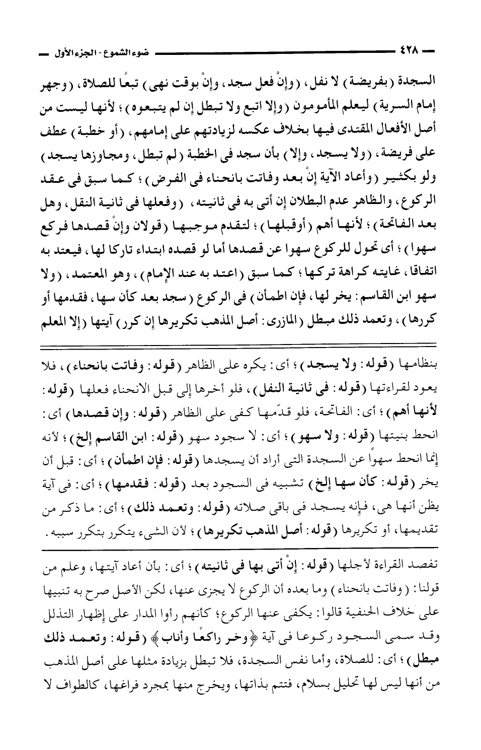 السجدة (بفريضة) لا نفل، (وإن فعل سجد، وإن بوقت نهى) تبعًا للصلاة، (وجهر إمام السرية) ليعلم المأمومون (وإلا اتبع ولا تبطل إن لم يتبعوه)؛ لأنها ليست من أصل الأفعال المقتدى فيها بخلاف عكسه لزيادتهم على إمامهم، (أو خطبة) عطف على فريضة، (ولا يسجد، وإلا) بأن سجد فى الخطبة (لم تبطل، ومجاوزها يسجد) ولو بكثير (وأعاد الآية إن بعد وفاتت بانحناء فى الفرض)؛ كما سبق فى عقد الركوع، والظاهر عدم البطلان إن أتى به فى ثانيته، (وفعلها فى ثانية النفل، وهل بعد الفاتحة)؛ لأنها أهم (أو قبلها)؛ لتقدم موجبها (فولان وإن قصدها فركع سهوا)؛ أى تحول للركوع سهوا عن قصدها أما لو قصده ابتداء تاركا لها، فيعتد به اتفاقا، غايته كراهة تركها؛ كما سبق (اعتد به عند الإمام)، وهو المعتمد، (ولا سهو ابن القاسم: يخر لها، فإن اطمأن) فى الركوع (سجد بعد كأن سها، فقدمها أو كررها)، وتعمد ذلك مبطل (المازري: أصل المذهب تكريرها إن كرر) آيتها (إلا المعلم