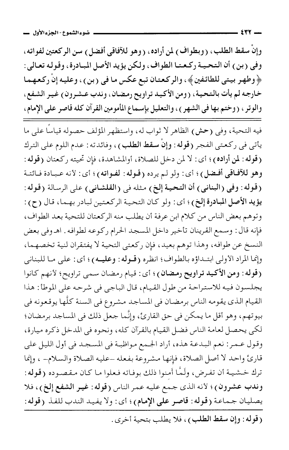 فيه التحية، وفى (حش) الظاهر لا ثواب له، واستظهر المؤلف حصوله قياسًا على ما يأتى فى ركعتى الفجر (قوله: وإن سقط الطلب)، وفائدته: عدم اللوم على الترك (قوله: لمن أراده)؛ أي: لا لمن دخل للصلاة، أو المشاهدة، فإن تحيته ركعتان (قوله: وهو للآفاقى أفضل)؛ أي: ولو لم يرده (قوله: لفواته)؛ أي: لأنه عبادة فائتة (قوله: وفى (البناني) أن التحية إلخ) مثله فى (القلشاني) على الرسالة (قوله: يؤيد الأصل المبادرة إلخ): أي: ولو كان التحية الركعتين لبادر بهما، قال (ح): وتوهم بعض الناس من كلام ابن عرفة أن يطلب منه الركعتان للتحية بعد الطواف، فإنه قال: وسمع القرينان تأخير داخل المسجد الحرام ركوعه لطوافه، اهـ وفى بعض النسخ عن طوافه، وهذا توهم بعيد، فإن ركعتى التحية لا يفترقان لنية تخصهما، وإنما المراد الأولى ابتداؤه بالطواف؛ انظره (قوله: وعليه)؛ أي: على ما للبنانى (قوله: ومن الأكيد تراويح رمضان)؛ أي: قيام رمضان سمى تراويح؛ لأنهم كانوا يجلسون فيه للاستراحة من طول القيام، قال الباجى فى شرحه على الموطأ: هذا القيام الذى يقومه الناس برمضان فى المساجد مشروع فى السنة كلَّها يوقعونه فى بيوتهم، وهو أقل ما يمكن فى حق القارئ، وإنَّما جعل ذلك فى المساجد برمضان؛ لكى يحصل لعامة الناس فضل القيام بالقرآن كله، ونحوه فى المدخل ذكره ميارة، وقول عمر: نعم البدعة هذه، أراد الجمع مواظبة فى المسجد فى أول الليل على قارئ واحد لا أصل الصلاة، فإنها مشروعة بفعله - عليه الصلاة والسلام -، وإنما ترك خشية أن تفرض، ولمَّا أمنوا ذلك بوفاته فعلوا ما كان مقصوده (قوله: وندب عشرون)؛ لأنه الذى جمع عليه عمر الناس (قوله: غير الشفع إلخ)، فلا يصليان جماعة (قوله: قاصر على الإمام)؛ أي: ولا يفيد الندب للفذ (قوله:
