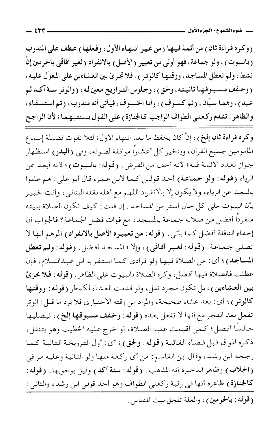 (وكره قراءة ثان) من أئمة فيها (من غير انتهاء الأول، وفعلها) عطف على المندوب (بالبيوت)، ولو جماعة، فهو أولى من تعبير (الأصل) بالانفراد (لغير آفاقى بالحرمين إن نشط، ولم تعطل المساجد، ووقتها كالوتر)، فلا تجزئ بين العشاءين على المعوّل عليه، (وخفف مسبوقها ثانيته، ولحق)، وجلوس التراويح معين له، (والوتر سنة آكد ثم عيد)، وهما سيّان، (ثم كسوف)، وأما الخسوف، فيأتى أنه مندوب، (ثم استسقاء، والظاهر: تقدم ركعتى الطواف الواجب كالجنازة) على القول بسنتيهما؛ لأن الراجح