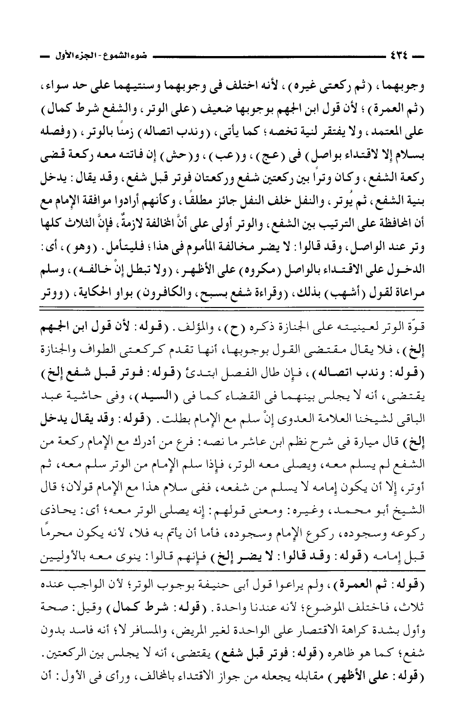 (قوله: ثم العمرة)، ولم يراعوا قول أبى حنيفة بوجوب الوتر؛ لأن الواجب عنده ثلاث، فاختلف الموضوع؛ لأنه عندنا واحدة. (قوله: شرط كمال) وقيل: صحة وأول بشدة كراهة الاقتصار على الواحدة لغير المريض، والمسافر لا؛ أنه فاسد بدون شفع؛ كما هو ظاهره (قوله: فوتر قبل شفع) يقتضي، أنه لا يجلس بين الركعتين. (قوله: على الأظهر) مقابله يجعله من جواز الاقتداء بالمخالف، ورأى فى الأول: أن