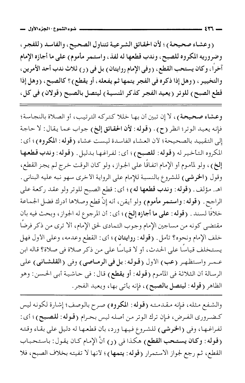 والشفع مثله، فإنه مقدمته (قوله: المكروه) صرح بالوصف؛ إشارة لكونه ليس كضرورى الفرض، فإن ترك الوتر من أصله ليس بحرام (قوله: للصبح)؛ أي: لفراغها، وفى (الخرشي) للشروع فيها ورد، بأن قطعها له دليل على بقاء وقته (قوله: وكان يستحب القطع) هكذا فى (ر) أنَّ الإمام كان يقول: باستحباب القطع، ثم رجع لجواز الاستمرار (قوله: يتمها)؛ لأنها لا تفيته بخلاف الصبح، فلا