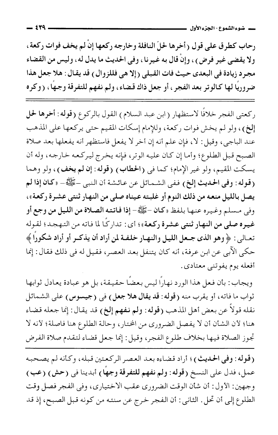ركعتى الفجر خلافًا لاستظهار (ابن عبد السلام) القول بالركوع (قوله: أخرها لحل إلخ)، ولو لم يخش فوات ركعة، وللإمام إسكات الميم حتى يركعها على المذهب عند الباجي، وقيل: لا، فإن علم أنه إن أخر لا يفعل فاستظهر أنه يفعلها بعد صلاة الصبح قبل الطلوع؛ وأما إن كان عليه الوتر، فإنه يخرج ليركعه خارجه، وله أن يسكت المقيم، ولو غير الإمام؛ كما فى (الحطاب) (قوله: إن لم يخف)، ولو وهما (قوله: وفى الحديث إلخ) ففى الشمائل عن عائشة أن النبى - صلى الله عليه وسلم - "كان إذا لم يصل بالليل منعه من ذلك النوم أو غلبته عيناه صلى من النهار ثنتى عشرة ركعة"، وفى مسلم وغيره عنها بلفظ "كان - صلى الله عليه وسلم - إذا فاتته الصلاة من الليل من وجع أو غيره صلى من النهار ثنتى عشرة ركعة"؛ أي: تداركًا لما فاته من التهجد؛ لقوله تعالى: {وهو الذى جعل الليل والنهار خلفة لمن أراد أن يذكر أو أراد شكورًا} حكى الآبى عن ابن عرفة، أنه كان يتنفل بعد العصر، فقيل له فى ذلك فقال: إنما أفعله يوم يفوتنى معتادي.