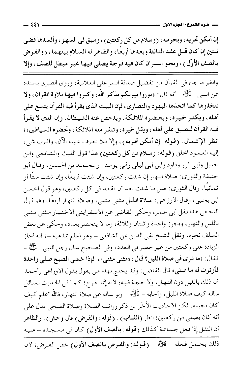 وانظر ما جاء فى القرآن من تفضيل صدقة السر على العلانية، وروى الطبرى بسنده عن النبى - صلى الله عليه وسلم - أنه قال: "نوروا بيوتكم بذكر الله، وكثروا فيها تلاوة القرآن، ولا تتخذوها كما اتخذها اليهود والنصارى، فإن البيت الذى يقرأ فيه القرآن يتسع على أهله، ويكثر خيره، ويحضره الملائكة، ويدحض عنه الشيطان، وإن الذى لا يقرأ فيه القرآن ليضيق على أهله، ويقل خيره، وتنفر منه الملائكة، وتحضره الشياطين"؛ انظر الإكمال. (قوله: إن أمكن تحريه)، وإلا فلا تعرف عينه الآن، وأقرب شيء إليه العمود المخلق (قوله: وسلام من كل ركعتين) هذا قول الليث والشافعى وابن حنبل وأبى ثور وداود وابن أبى ليلى وأبى يوسف ومحمد بن الحسن، وقال أبو حنيفة والثوري: صلاة النهار إن شئت ركعتين، وإن شئت أربعًا، وإن شئت ستًا أو ثمانيًا. وقال الثوري: صل ما شئت بعد أن تقعد فى كل ركعتين، وهو قول الحسن ابن يحيى، وقال الأوزاعي: صلاة الليل مثنى مثنى، وصلاة النهار أربعًا، وهو قول النخعى هذا نقل أبى عمر، وحكى القاضى عن الأسفرايينى الاختيار مثنى مثنى بالليل والنهار، ويجوز واحدة واثنتان وثلاثة، وما لا ينحصر بعدد، وحكى عن بعض السلف نحوه، ونقل الشيخ تقى الدين عن الشافعى - وهو أعلم بمذهبه -؛ أنه أجاز الزيادة على ركعتين من غير حصر فى العدد، وفى الصحيح سأل رجل النبى - صلى الله عليه وسلم - فقال: "ما ترى فى صلاة الليل؟ قال: "مثنى مثنى"، فإذا خشى الصبح صلى واحدة فأوترت له ما صلى" قال القاضي: وقد يحتج بهذا من يقول بقول الأوزاعى وأحمد أن ذلك بالليل دون النهار، ولا حجة فيه؛ لأنه إنما خرج؛ كما فى الحديث لسائل سأله كيف صلاة الليل، وأجابه - صلى الله عليه وسلم - ولو سأله عن صلاة النهار، فالله أعلم كيف كان يجيبه، لكن الأحاديث الأخر من ذكر رواتب الصلاة وصلاة الضحى تدل على أنه كان يصلى من ركعتين؛ انظر (القباب). (قوله: والفرض) قال (حش): والظاهر أن النفل إذا فعل جماعة كذلك (قوله: بالصف الأول) كان فى مسجده - عليه