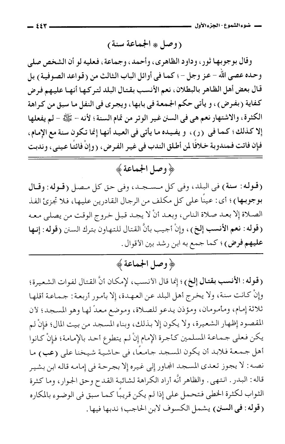 وقال بوجوبها ثور، وداود الظاهري، وأحمد، وجماعة، فعليه لو أن الشخص صلى وحده عصى الله - عز وجل -؛ كما فى أوائل الباب الثالث من (قواعد الصوفية) بل قال بعض أهل الظاهر بالبطلان، نعم الأنسب بقتال البلد لتركها أنها عليهم فرض كفاية (بفرض)، ويأتى حكم الجمعة فى بابها، ويجرى فى النفل ما سبق من كراهة الكثرة، والاشتهار نعم هى فى السنن غير الوتر من تمام السنة؛ لأنه - صلى الله عليه وسلم - لم يفعلها إلا كذلك؛ كما فى (ر)، ويفيده ما يأتى فى العيد أنها إنما تكون سنة مع الإمام، فإن فاتت فمندوبة خلافًا لمن أطلق الندب فى غير الفرض، (وإن فائتًا عيني، وندبت