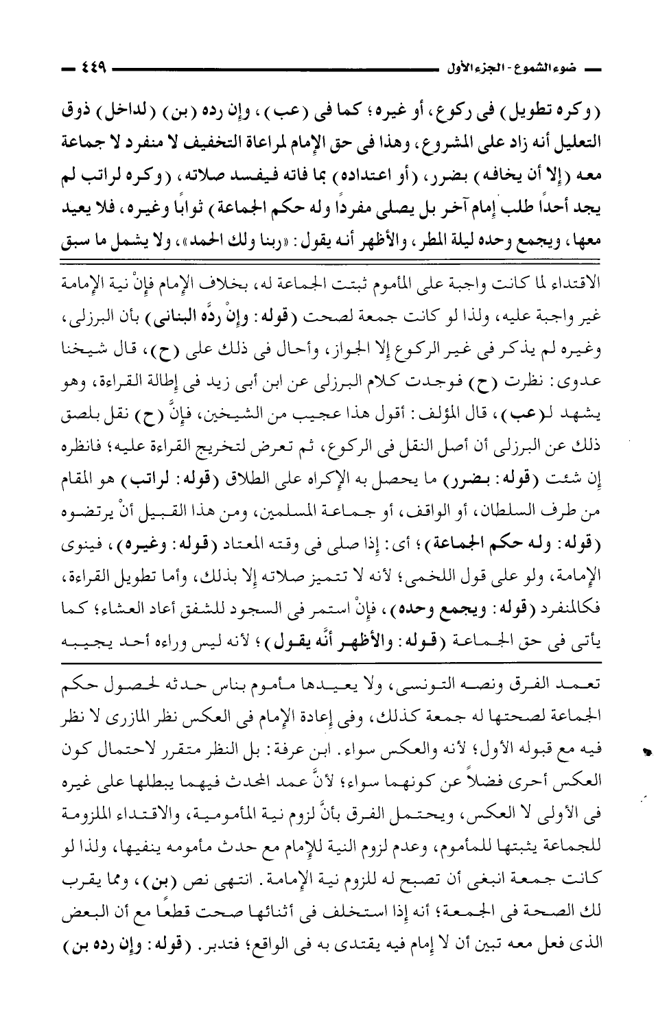 الاقتداء لما كانت واجبة على المأموم ثبتت الجماعة له، بخلاف الإمام فإن نية الإمامة غير واجبة عليه، ولذا لو كانت جمعة لصحت (قوله: وإن ردّه البناني) بأن البرزلي، وغيره لم يذكر فى غير الركوع إلا الجواز، وأحال فى ذلك على (ح)، قال شيخنا عدوى: نظرت (ح) فوجدت كلام البرزلى عن ابن أبى زيد فى إطالة القراءة، وهو يشهد لـ (عب)، قال المؤلف: أقول هذا عجيب من الشيخين، فإنَّ (ح) نقل بلصق ذلك عن البرزلى أن أصل النقل فى الركوع، ثم تعرض لتخريج القراءة عليه؛ فانظره إن شئت (قوله: بضرر) ما يحصل به الإكراه على الطلاق (قوله: لراتب) هو المقام من طرف السلطان، أو الواقف، أو جماعة المسلمين، ومن هذا القبيل أن يرتضوه (قوله: وله حكم الجماعة)؛ أي: إذا صلى فى وقته المعتاد (قوله: وغيره)، فينوى الإمامة، ولو على قول اللخمي؛ لأنه لا تتميز صلاته إلا بذلك، وأما تطويل القراءة، فكالمنفرد (قوله: ويجمع وحده)، فإن استمر فى السجود للشفق أعاد العشاء؛ كما يأتى فى حق الجماعة (قوله: والأظهر أنَّه يقول)؛ لأنه ليس وراءه أحد يجيبه