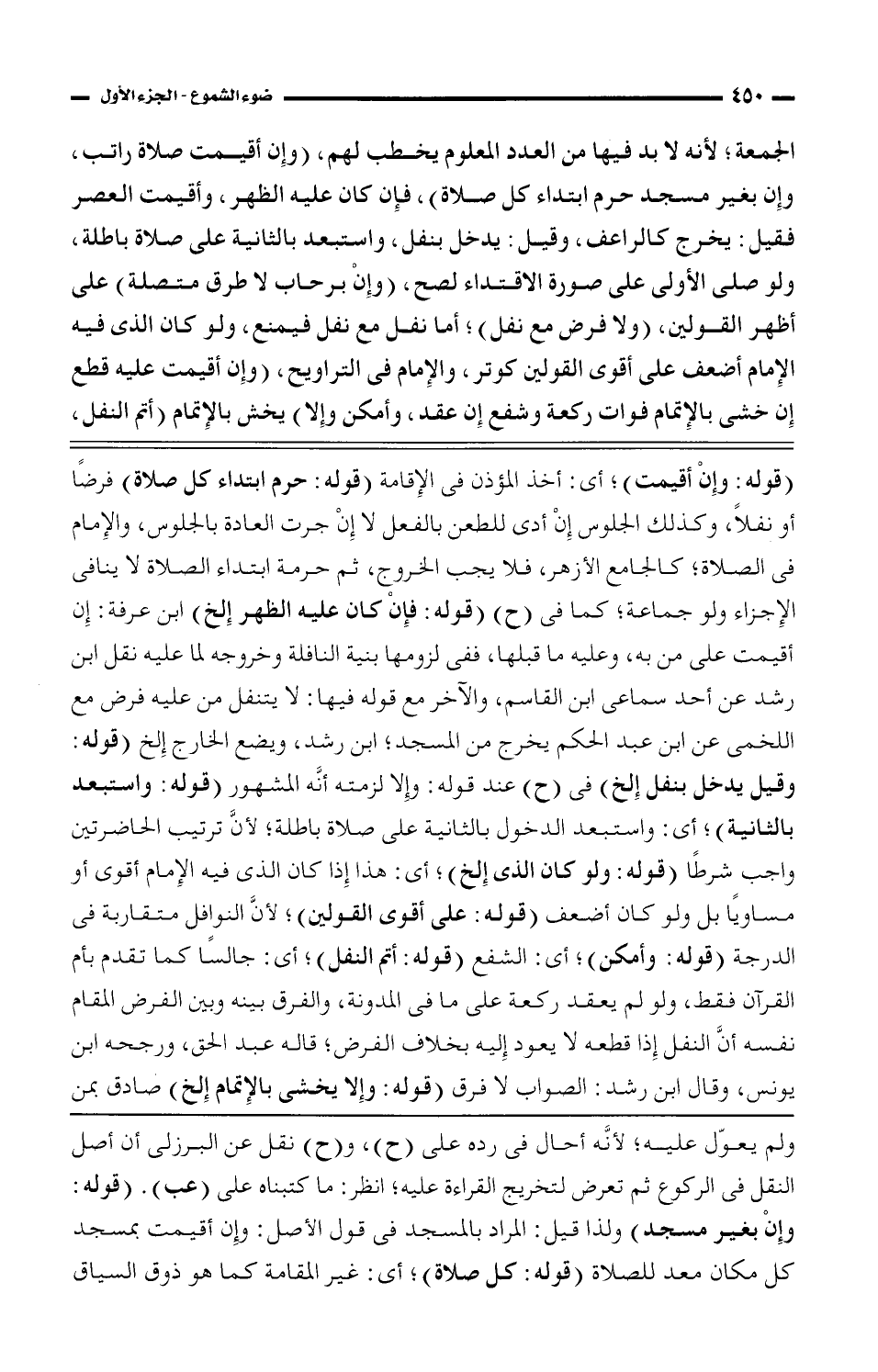 الجمعة؛ لأنه لابد فيها من العدد المعلوم يخطب بهم، (وإن أقيمت صلاة راتب، وإن بغير مسجد حرم ابتداء كل صلاة)، فإن كان عليه الظهر، وأقيمت العصر فقيل: يخرج كالراعف، وقيل: يدخل بنفل، واستبعد بالثانية على صلاة باطلة، ولو صلى الأولى على صورة الاقتداء لصح، (وإن برحاب لا طرق متصلة) على أظهر القولين، (ولا فرض مع نفل)؛ أما نفل مع نفل فيمنع، ولو كان الذى فيه الإمام أضعف على أقوى القولين كوتر، والإمام فى التراويح، (وإن أقيمت عليه قطع إن خشى بالإتمام فوات ركعة وشفع إن عقد، وأمكن وإلا) يخش بالإتمام (أتم النفل،
