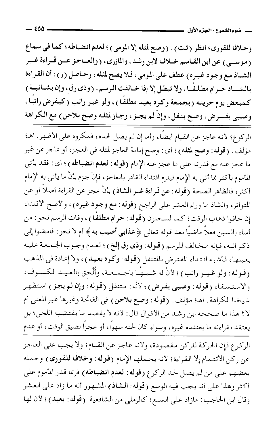 الركوع؛ لأنه عاجز عن القيام أيضًا، وأما إن لم يصل لحده، فمكروه على الأظهر. اهـ؛ مؤلف. (قوله: وصح لمثله)؛ أي: وصح إمامة العاجز لمثله فى العجز، أو عاجز عن غير ما عجز عنه مع قدرته على ما عجز عنه الإمام (قوله: لعدم انضباطه)؛ أي: فقد يأتى المأموم بأكثر مما أتى به الإمام فيلزم اقتداء القادر بالعاجز، فإن جزم بأنَّ ما يأتى به الإمام أكثر، فالظاهر الصحة (قوله: عن قراءة غير الشاذ) بأن عجز عن القراءة أصلًا أو عن المتواتر، والشاذ ما وراء العشر على الراجح (قوله: مع وجود غيره)، والأصح الاقتداء إن خافوا ذهاب الوقت؛ كما لسحنون (قوله: حرام مطلقًا)، وفات الرسم نحو: من أساء بالسين فعلًا ماضيًا بعد قوله تعالى {عذابى أصيب به} أم لا نحو: فامضوا إلى ذكر الله، فإنه مخالف للرسم (قوله: وذى رق إلخ)؛ لعدم وجوب الجمعة عليه بعينها، فأشبه اقتداء المفترض بالتنفل (قوله: وكره بعيد)، ولا إعادة فى المذهب (قوله: ولو غير راتب)؛ لأنَّ له شبهًا بالجمعة، وألحق بالعيد الكسوف، والاستسقاء (قوله: وصبى بفرض)؛ لأنَّه: متنفل (قوله: وإن لم يجز) استظهر شيخنا الكراهة. اهـ؛ مؤلف. (قوله: وصح بلاحن) فى الفاتحة وغيرها غير المعنى أم لا؟ هذا ما صححه ابن رشد من الأقوال قال: لأنه لا يقصد ما يقتضيه اللحن؛ بل يعتقد بقراءته ما يعتقده غيرهن وسواء كان لحنه سهوًا، أو عجزًا لضيق الوقت، أو عدم