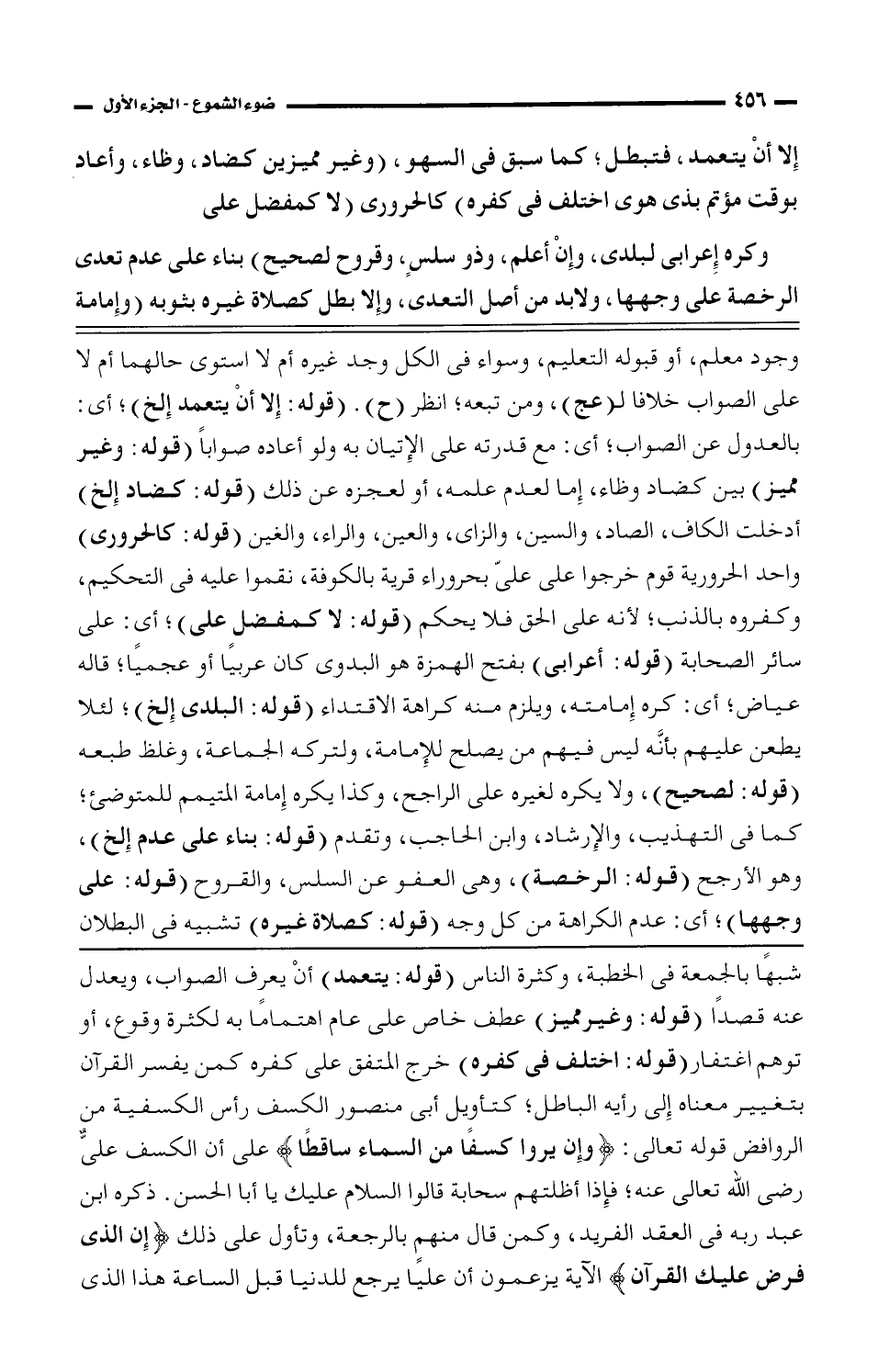 وجود معلم، أو قبوله التعليم، وسواء فى الكل وجد غيره أم لا استوى حالهما أم لا على الصواب خلافًا لـ (عج)، ومن تبعه؛ انظر (ح). (قوله: إلا أن يتعمد إلخ)؛ أي: بالعدول عن الصواب؛ أي: مع قدرته على الإتيان به ولو أعاده صوابًا (قوله: وغير مميز) بين كضاد وظاء، إما لعدم علمه، أو لعجزه عن ذلك (قوله: كضاد إلخ) أدخلت الكاف، الصاد، والسين، والزاي، والعين، والراء، والغين (قوله: كالحروري) واحد الحرورية قوم خرجوا على علىّ بحروراء قرية بالكوفة، نقموا عليه فى التحكيم، وكفروه بالذنب؛ لأنه على الحق فلا يحكم (قوله: لا كمفضل على)؛ أي: على سائر الصحابة (قوله: أعرابي) بفتح الهمزة هو البدوى كان عربيًا أو عجميًا؛ قاله عياض؛ أي: كره إمامته، ويلزم منه كراهة الاقتداء (قوله: البلدى إلخ)؛ لئلا يطعن عليهم بأنَّه ليس فيهم من يصلح للإمامة، ولتركه الجماعة، وغلظ طبعه (قوله: لصحيح)، ولا يكره لغيره على الراجح، وكذا يكره إمامة المتيمم للمتوضئ؛ كما فى التهذيب، والإرشاد، وابن الحاجب، وتقدم (قوله: بناء على عدم إلخ)، وهو الأرجح (قوله: الرخصة)، وهى العفو عن السلس، والقروح (قوله: على وجهها)؛ أي: عدم الكراهة من كل وجه (قوله: كصلاة غيره) تشبيه فى البطلان