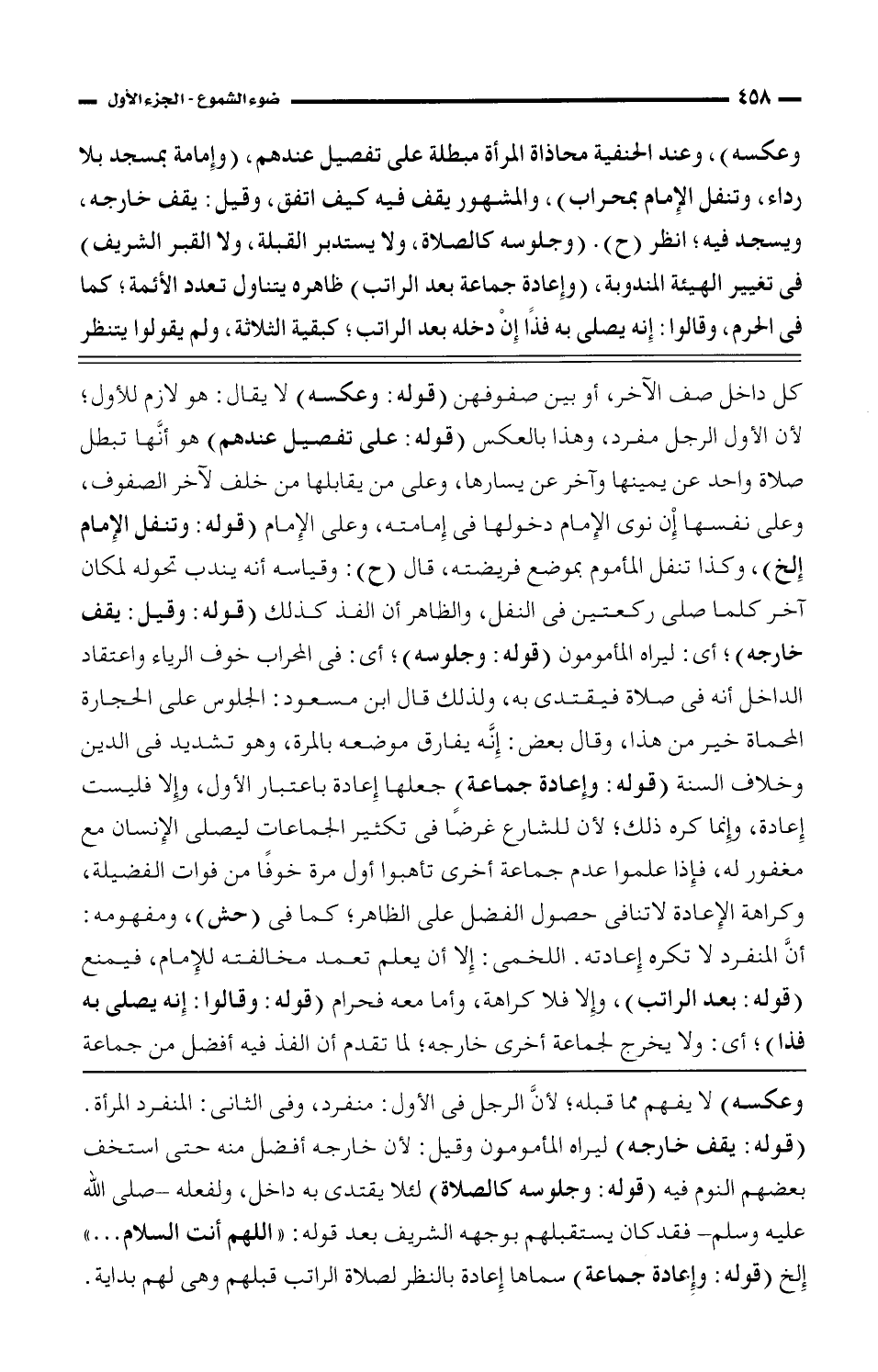 وعكسه) لا يفهم مما قبله؛ لأنَّ الرجل فى الأول: منفرد، وفى الثاني: المنفرد المرأة. (قوله: يقف خارجه) ليراه المأمومون وقيل: لأن خارجه أفضل منه حتى استخف بعضهم النوم فيه (قوله: وجلوسه كالصلاة) لئلا يقتدى به داخل، ولفعله - صلى الله عليه وسلم - فقد كان يستقبلهم بوجهه الشريف بعد قوله: "اللهم أنت السلام ... " إلخ (قوله: وإعادة جماعة) سماها إعادة بالنظر لصلاة الراتب قبلهم وهى لهم بداية.