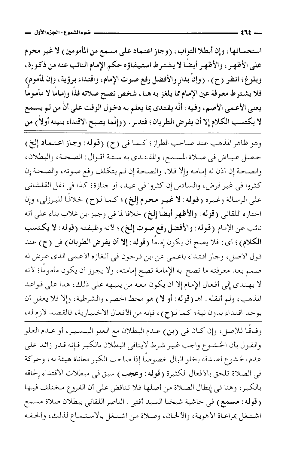 استحسانها، وإن أبطلا الثواب، (وجاز اعتماد على مسمع من المأمومين) لا غير محرم على الأظهر، والأظهر أيضًا لا يشترط استيفاؤه حكم الإمام النائب عنه من ذكورة، وبلوغ؛ انظر (ح). (وإن بدارٍ والأفضل رفع صوت الإمام، واقتداء برؤية، وإن لمأمومٍ) فلا يشترط معرفة عين الإمام مما يلغز به هنا، شخص تصح صلاته فذًا وإمامًا لا مأمومًا يعنى الأعمى الأصم، وفيه: أنَّه يقتدى بما يعلم به دخول الوقت على أنَّ من لم يسمع لا يكتسب الكلام إلا أن يفرض الطريان؛ فتدبر. (وإنَّما يصبح الاقتداء بنيته أولًا) من