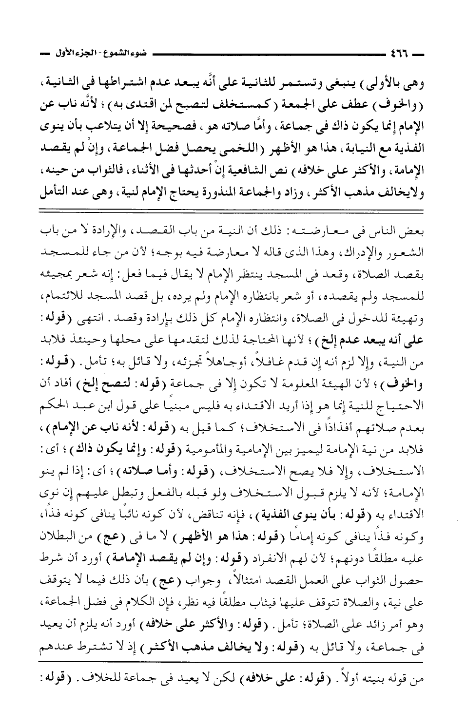 بعض الناس فى معارضته: ذلك أن النية من باب القصد، والإرادة لا من باب الشعور والإدراك، وهذا الذى قاله لا معارضة فيه بوجه؛ لأن من جاء للمسجد بقصد الصلاة، وقعد فى المسجد ينتظر الإمام لا يقال فيما فعل، إنه شعر بمجيئه للمسجد ولم يقصده، أو شعر بانتظاره الإمام ولم يرده، بل قصد المسجد للائتمام، وتهيئة للدخول فى الصلاة، وانتظاره الإمام كل ذلك بإرادة وقصد. انتهى (قوله: على أنه يبعد عدم إلخ)؛ لأنها المحتاجة لذلك لتقدمها على محلها وحينئذ فلابد من النية، وإلا لزم أنه إن قدم غافلًا، أو جاهلًا تجزئه، ولا قائل به؛ تأمل. (قوله: والخوف)؛ لأن الهيئة المعلومة لا تكون إلا فى جماعة (قوله: لتصح إلخ) أفاد أن الاحتياج للنية إنما هو إذًا أريد الاقتداء به فليس مبنيًا على قول ابن عبد الحكم بعدم صلاتهم أفذاذًا فى الاستخلاف؛ كما قيل به (قوله: لأنه ناب عن الإمام)، فلابد من نية الإمامة ليميز بين الإمامية والمأمومية (قوله: وإنما يكون ذاك)؛ أي: الاستخلاف، وإلا فلا يصح الاستخلاف، (وقوله: وأما صلاته)؛ أي: إذا لم ينو الإمامة؛ لأنه لا يلزم قبول الاستخلاف ولو قبله بالفعل وتبطل عليهم إن نوى الاقتداء به (قوله: بأن ينوى الفذية)، فإنه تناقض، لأن كونه نائبًا ينافى كونه فذًا، وكونه فذًا ينافى كونه إمامًا (قوله: هذا هو الأظهر) لا ما فى (عج) من البطلان عليه مطلقًا دونهم؛ لأن لهم الانفراد (قوله: وإن لم يقصد الإمامة) أورد أن شرط حصول الثواب على العمل القصد امتثالًا، وجواب (عج) بأن ذلك فيما لا يتوقف على نية، والصلاة تتوقف عليها فيثاب مطلقًا فيه نظر، فإن الكلام فى فضل الجماعة، وهو أمر زائد على الصلاة؛ تأمل. (قوله: والأكثر على خلافه) أورد أنه يلزم أن يعيد فى جماعة، ولا قائل به (قوله: ولا يخالف مذهب الأكثر) إذ لا تشترط عندهم