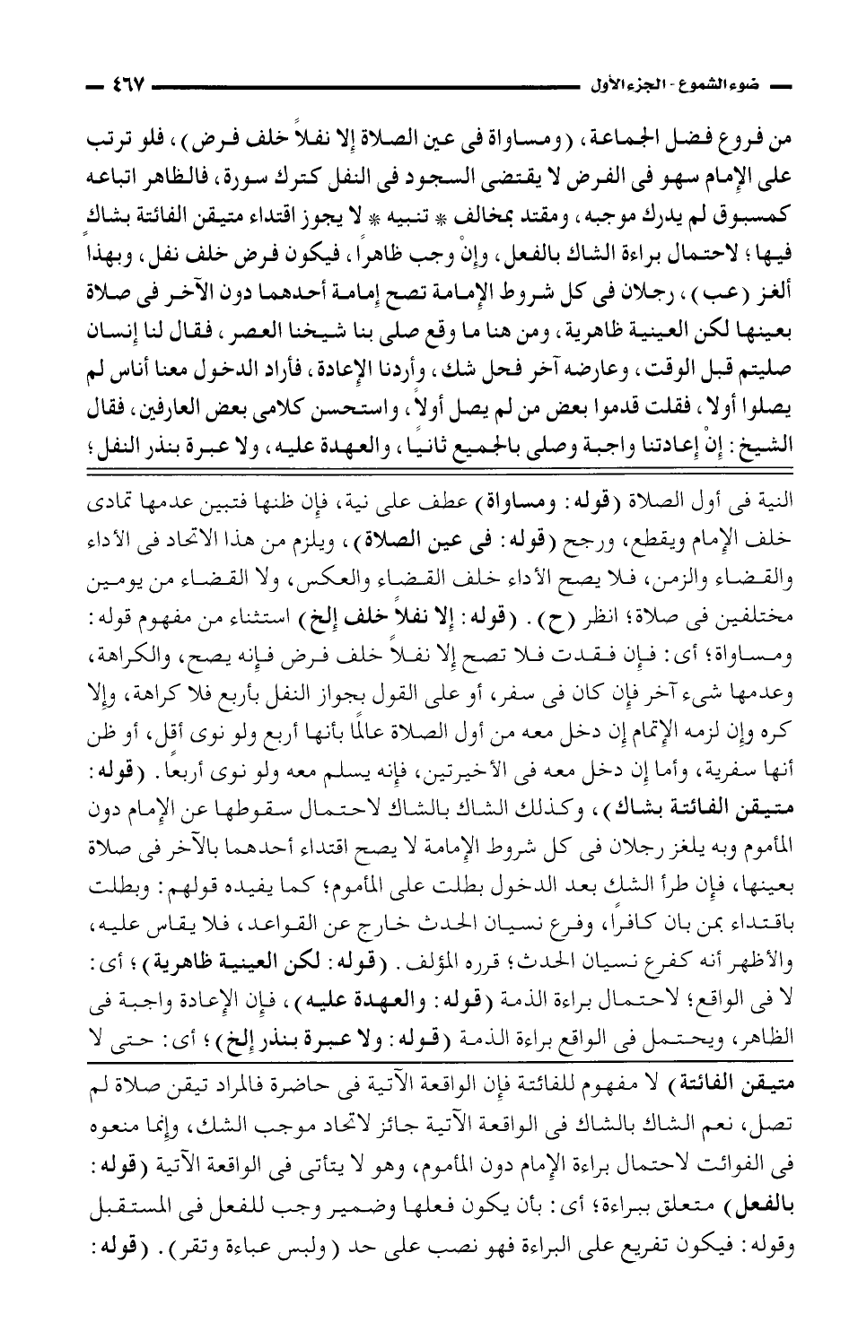 النية فى أول الصلاة (قوله: ومساواة) عطف على نية، فإن ظنها فتبين عدمها تمادى خلف الإمام ويقطع، ورجح (قوله: فى عين الصلاة)، ويلزم من هذا الاتحاد فى الأداء والقضاء والزمن، فلا يصح الأداء خلف القضاء والعكس، ولا القضاء من يومين مختلفين فى صلاة؛ انظر (ح). (قوله: إلا نفلًا خلف إلخ) استثناء من مفهوم قوله: ومساواة؛ أي: فإن فقدت فلا تصح إلا نفلًا خلف فرض فإنه يصح، والكراهة، وعدمها شيء آخر فإن كان فى سفر، أو على القول بجواز النفل بأربع فلا كراهة، وإلا كره وإن لزمه الإتمام إن دخل معه من أول الصلاة عالمًا بأنها أربع ولو نوى أقل، أو ظن أنها سفرية، وأما إن دخل معه فى الأخيرتين، فإنه يسلم معه ولو نوى أربعًا. (قوله: متيقن الفائتة بشاك)، وكذلك الشاك بالشاك لاحتمال سقوطها عن الإمام دون المأموم وبه يلغز رجلان فى كل شروط الإمامة لا يصح اقتداء أحدهما بالآخر فى صلاة بعينها، فإن طرأ الشك بعد الدخول بطلت على المأموم؛ كما يفيده قولهم: وبطلت باقتداء بمن بان كافرًا، وفرع نسيان الحدث خارج عن القواعد، فلا يقاس عليه، والأظهر أنه كفرع نسيان الحدث؛ قرره المؤلف. (قوله: لكن العينية ظاهرية)؛ أي: لا فى الواقع؛ لاحتمال براءة الذمة (قوله: والعهدة عليه)، فإن الإعادة واجبة فى الظاهر، ويحتمل فى الواقع براءة الذمة (قوله: ولا عبرة بنذر إلخ)؛ أي: حتى لا