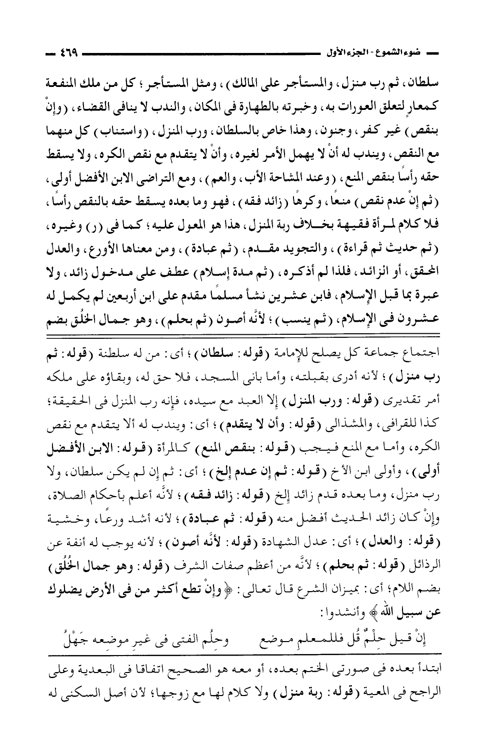 سلطان، ثم رب منزل، والمستأجر على المالك)، ومثل المستأجر؛ كل من ملك المنفعة كمعار لتعلق العورات به، وخبرته بالطهارة فى المكان، والندب لا ينافى القضاء، (وإن بنقص) غير كفر، وجنون، وهذا خاص بالسلطان، ورب المنزل، (واستناب) كل منهما مع النقص، ويندب له أن لا يهمل الأمر لغيره، وأن لا يتقدم مع نقص الكره، ولا يسقط حقه رأسًا بنقص المنع، (وعند المشاحة الأب، والعم)، ومع التراضى الابن الأفضل أولى، (ثم إن عدم نقص) منعًا، وكرهًا (زائد فقه)، فهو وما بعده يسقط حقه بالنقص رأسًا، فلا كلام لمرأة فقهية بخلاف ربة المنزل، هذا هو المعول عليه؛ كما فى (ر) وغيره، (ثم حديث ثم قراءة)، والتجويد مقدم، (ثم عبادة)، ومن معناها الأورع، والعدل المحقق، أو الزائد، فلذا لم أذكره، (ثم مدة إسلام) عطف على مدخول زائد، ولا عبرة بما قبل الإسلام، فابن عشرين نشأ مسلمًا مقدم على ابن أربعين لم يكمل له عشرون فى الإسلام، (ثم ينسب)؛ لأنَّه أصون (ثم بحلم)، وهو جمال الخلق بضم