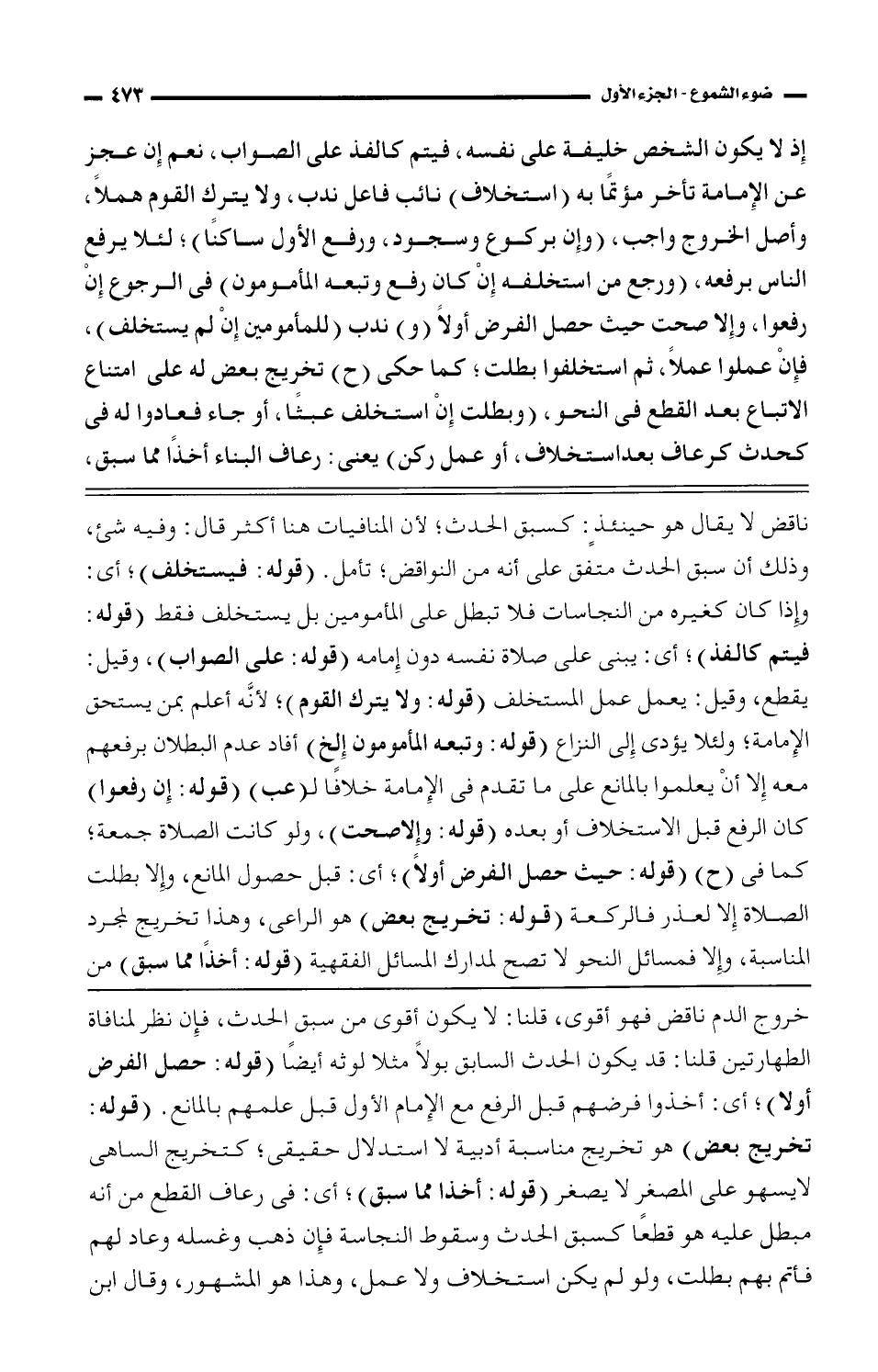 خروج الدم ناقض فهو أقوى، قلنا: لا يكون أقوى من سبق الحدث، فإن نظر لمنافاة الطهارتين قلنا: قد يكون الحدث السابق بولًا مثلا لوثه أيضًا (قوله: حصل الفرض أولا)؛ أي: أخذوا فرضهم قبل الرفع مع الإمام الأول قبل علمهم بالمانع. (قوله: تخريج بعض) هو تخريج مناسبة أدبية لا استدلال حقيقي؛ كتخريج الساهى لا يسهو على المصغر لا يصغر (قوله: أخذا مما سبق)؛ أي: فى رعاف القطع من أنه مبطل عليه هو قطعًا كسبق الحدث وسقوط النجاسة فإن ذهب وغسله وعاد لهم فأتم بهم بطلت، ولو لم يكن استخلاف ولا عمل، وهذا هو المشهور، وقال ابن