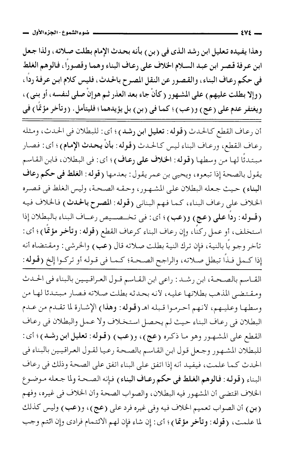 أن رعاف القطع كالحدث (قوله: تعليل ابن رشد)؛ أي: للبطلان فى الحديث، ومثله رعاف القطع، ورعاف البناء ليس كالحدث (قوله: بأن يحدث الإمام)؛ أي: فصار مبتدئًا لها من وسطها (قوله: الخلاف على رعاف)؛ أي: فى البطلان، فابن القاسم ويقول بالصحة إذا تبعوه، ويحيى بن عمر يقول: بعدمها (قوله: الغلط فى حكم رعاف البناء) حيث جعله البطلان على المشهور، وحقه الصحة، وليس الغلط فى قصره الخلاف على رعاف البناء، كما فهم البنانى (قوله: المصرح بالحدث) فالخلاف فيه (قوله: ردًا على (عجٍ) و (عب)؛ أي: فى تخصيص رعاف البناء بالبطلان إذا استخلف، أو عمل ركنًا، وإن رعاف البناء كرعاف القطع (قوله: وتأخر مؤتمًا)؛ أي: تأخر وجوبًا بالنية، فإن ترك النية بطلت صلاته قال (عب) والخرشي: ومقتضاه أنه إذا كمل فذًا تبطل صلاته، والراجح الصحة؛ كما فى قوله أو تركوا إلخ (قوله: