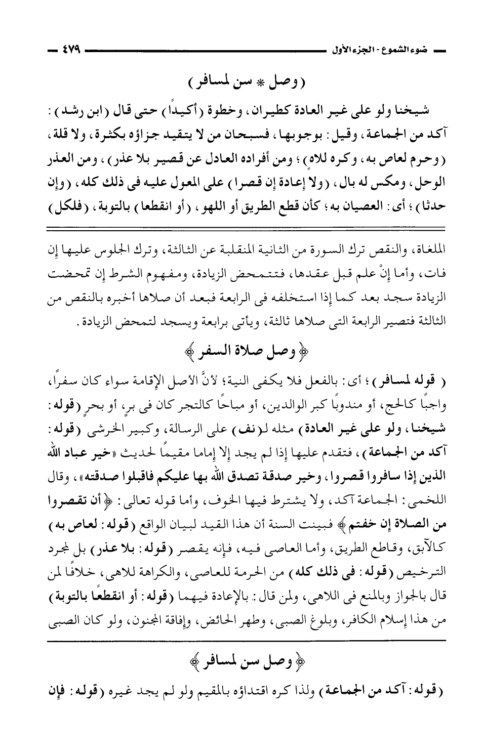 شيخنا ولو على غير العادة كطيران، وخطوة (أكيدًا) حتى قال (ابن رشد): آكد من الجماعة، وقيل: بوجوبها، فسبحان من لا يتقيد جزاؤه بكثرة، ولا قلة، (وحرم لعاص به، وكره للاه)؛ ومن أفراده العادل عن قصير بلا عذر)، ومن العذر الوحل، ومكس له بال، (ولا إعادة إن قصرا) على المعول عليه فى ذلك كله، (وإن حدثا)؛ أي: العصيان به؛ كأن قطع الطريق أو اللهو، (أو انقطعا) بالتوبة، (فلكل)