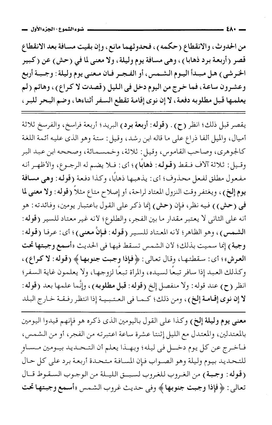 معنى يوم وليلة إلخ) وكذا على القول باليومين الذى ذكره هو فإنهم قيدوا اليومين بالمعتدلين، والمعتدل مع الليل إثنتا عشرة ساعة اعتبرته من الفجر، أو من الشمس، فأخرج عن كل يوم دخل فى ليله؛ وبهذا يعمل أن التحديد بيومين مساوٍ للتحديد بيوم وليلة وهو الصواب فإن المسافة متحدة أربعة برد على كل حال (قوله: وجبة) من الغروب للغروب لسبق الليلة من الوجوب السقوط قال تعالى: {فإذا وجبت جنوبها} وفى حديث غروب الشمس "أسمع وجبتها تحت