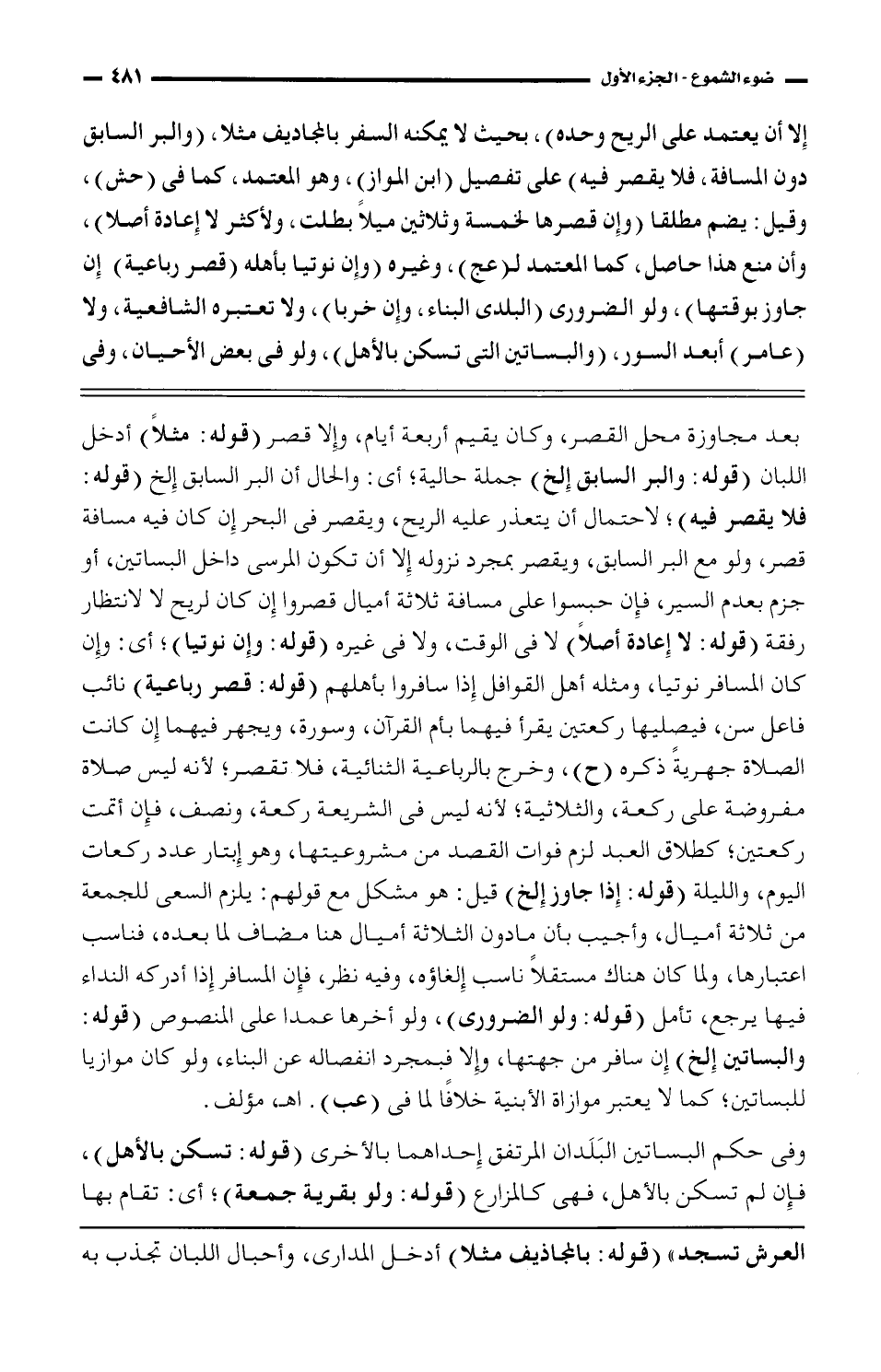 إلا أن يعتمد على الريح وحده)، بحيث لا يمكنه السفر بالمجاديف مثلا، (والبر السابق دون المسافة، فلا يقصر فيه) على تفصيل (ابن المواز)، وهو المعتمد، كما فى (حش)، وقيل: يضم مطلقا (وإن قصرها لخمسة وثلاثين ميلًا بطلت، ولأكثر لا إعادة أصلا)، وأن منع هذا حاصل، كما المعتمد لـ (عج)، وغيره (وإن نوتيا بأهله (قصر رباعية) إن جاوز بوقتها)، ولو الضرورى (البلدى البناء، وإن خربا)، ولا تعتبره الشافعية، ولا (عامر) أبعد السور، (والبساتين التى تسكن بالأهل)، ولو فى بعض الأحيان، وفى
