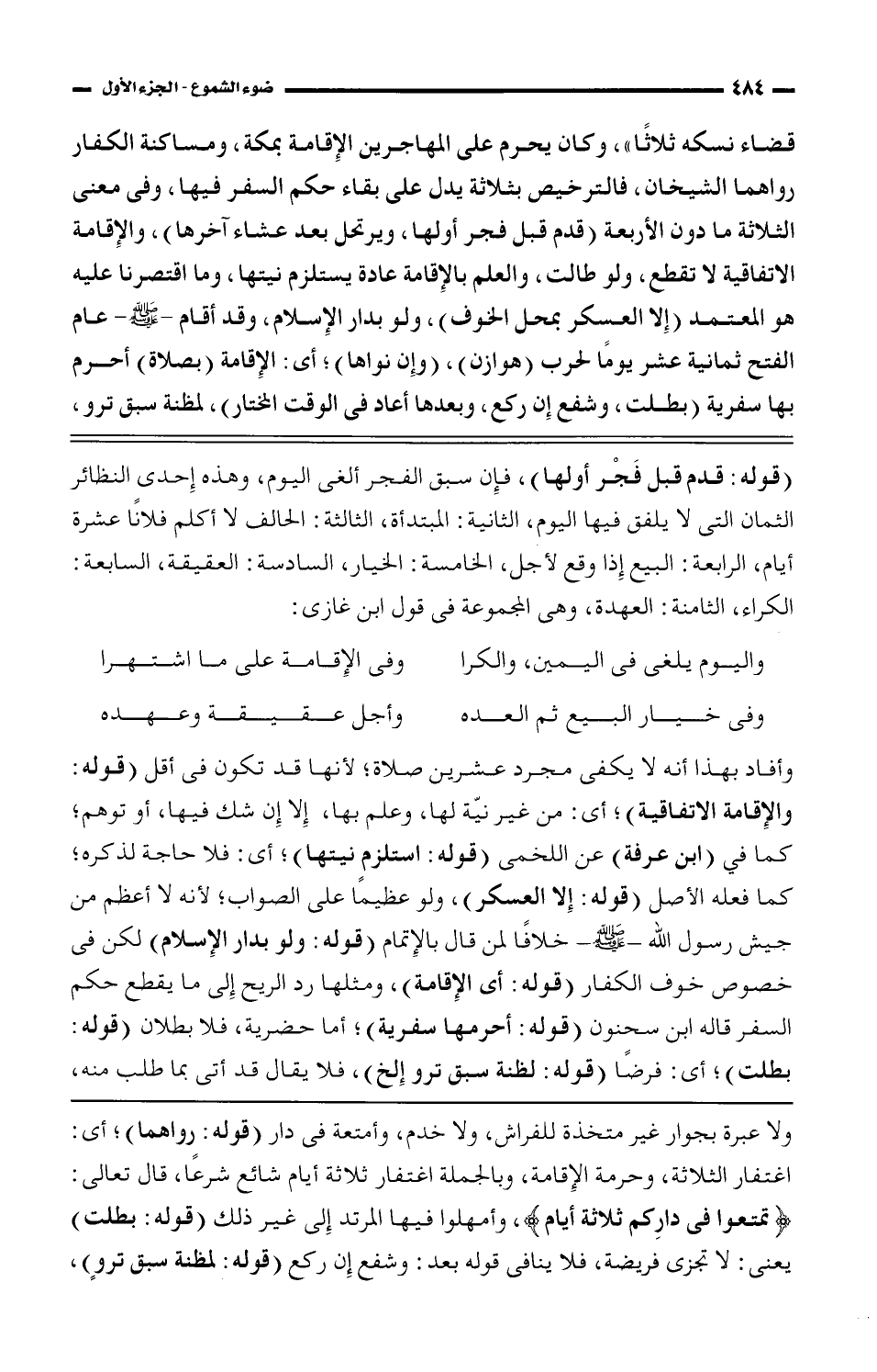 قضاء نسكه ثلاثًا"، وكان يحرم على المهاجرين الإقامة بمكة، ومساكنة الكفار رواهما الشيخان، فالترخيص بثلاثة يدل على بقاء حكم السفر فيها، وفى معنى الثلاثة ما دون الأربعة (قدم قبل فجر أولها، ويرتحل بعد عشاء آخرها)، والإقامة الاتفاقية لا تقطع، ولو طالت، والعلم بالإقامة عادة يستلزم نيتها، وما اقتصرنا عليه هو المعتمد (إلا العسكر بمحل الخوف)، ولو بدار الإسلام، وقد أقام - صلى الله عليه وسلم - عام الفتح ثمانية عشر يومًا لحرب (هوزان)، (وإن نواها)؛ أي: الإقامة (بصلاة) أحرم بها سفرية (بطلت، وشفع إن ركع، وبعدها أعاد فى الوقت المختار)، لمظنة سبق ترو،