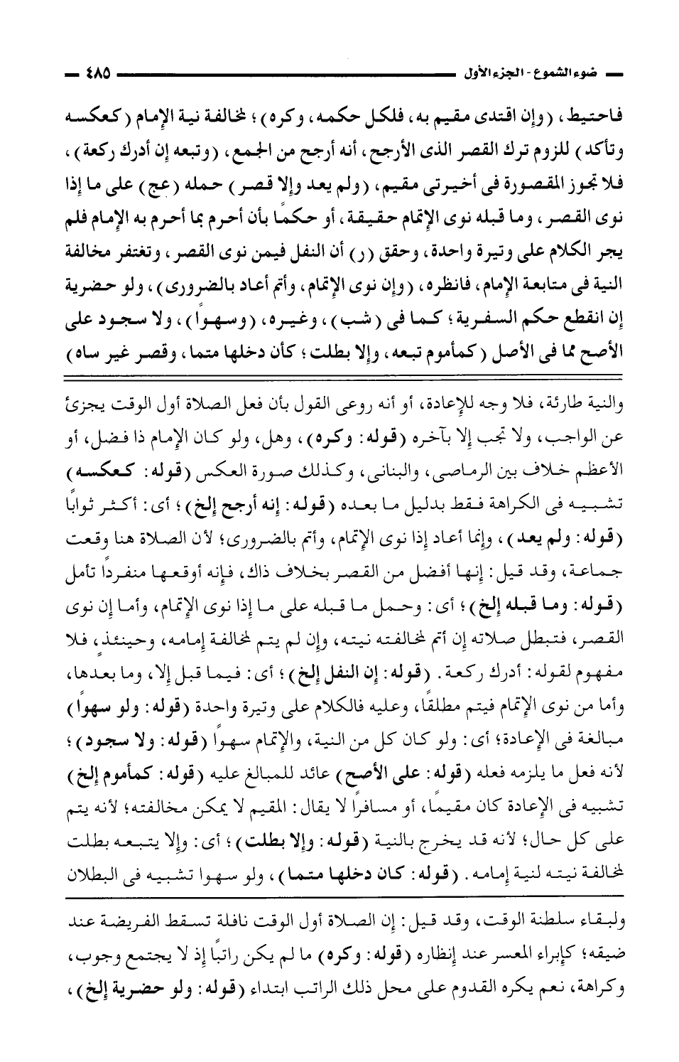 فاحتيط، (وإن اقتدى مقيم به، فلكل حكمه، وكره)؛ لمخالفة نية الإمام (كعكسه وتأكد) للزوم ترك القصر الذى الأرجح، أنه أرجح من الجمع، (وتبعه إن أدرك ركعة)، فلا تجوز المقصورة فى أخيرتى مقيم، (ولم يعد وإلا قصر) حمله (عج) على ما إذا نوى القصر، وما قبله نوى الإتمام حقيقة، أو حكمًا بأن أحرم بما أحرم به الإمام فلم يجر الكلام على وتيرة واحدة، وحقق (ر) أن النفل فيمن نوى القصر، وتغتفر مخالفة النية فى متابعة الإمام، فانظره، (وإن نوى الإتمام، وأتم أعاد بالضروري)، ولو حضرية إن انقطع حكم السفرية؛ كما فى (شب)، وغيره، (وسهوًا)، ولا سجود على الأصح مما فى الأصل (كمأموم تبعه، وإلا بطلت؛ كأن دخلها متما، وقصر غير ساه)