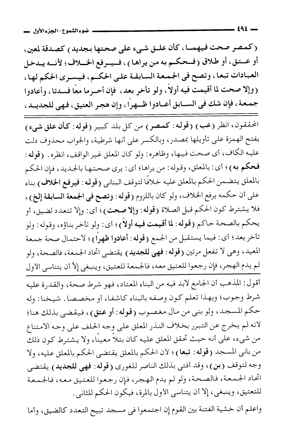 المحققون، انظر (عب) (قوله: كمصر) من كل بلد كبير (قوله: كأن علق شيء) بفتح الهمزة على تأويلها بمصدر، وبالكسر على أنها شرطية، والجواب محذوف دلت عليه الكاف، أى صحت فيها، وظاهره: ولو كان المعلق غير الواقف، انظره. (قوله: فحكم به)؛ أي: بالمعلق، وقوله: من يراها؛ أي: يرى صحتها بالجديد، فإن الحكم بالمعلق يتضمن الحكم بالمعلق عليه خلافًا لتوقف البنانى (قوله: فيرفع الخلاف) بناء على أن حكمه يرفع الخلاف، ولو كان باللزوم (قوله: وتصح فى الجمعة السابقة إلخ)، فلا يشترط كون الحكم قبل الصلاة (قوله: وإلا صحت)؛ أي: وإلا تتعدد لضيق، أو يحكم بالصحة حاكم (قوله: لما أقيمت فيه أولًا)؛ أي: ولو تأخر بناؤه، وقوله: ولو تأخر بعد؛ أي: فيما يستقبل من الجمع (قوله: أعادوا ظهرًا)؛ لاحتمال صحة جمعة المعيد، وهى لا تفعل مرتين (قوله: فهى للجديد) يقتضى اتحاد الجمعة، فالصحة، ولو لم يدم الهجر. فإن رجعوا للعتيق معه، فالجمعة للعتيق، وينبغى إلاّ أن يتناسى الأول
