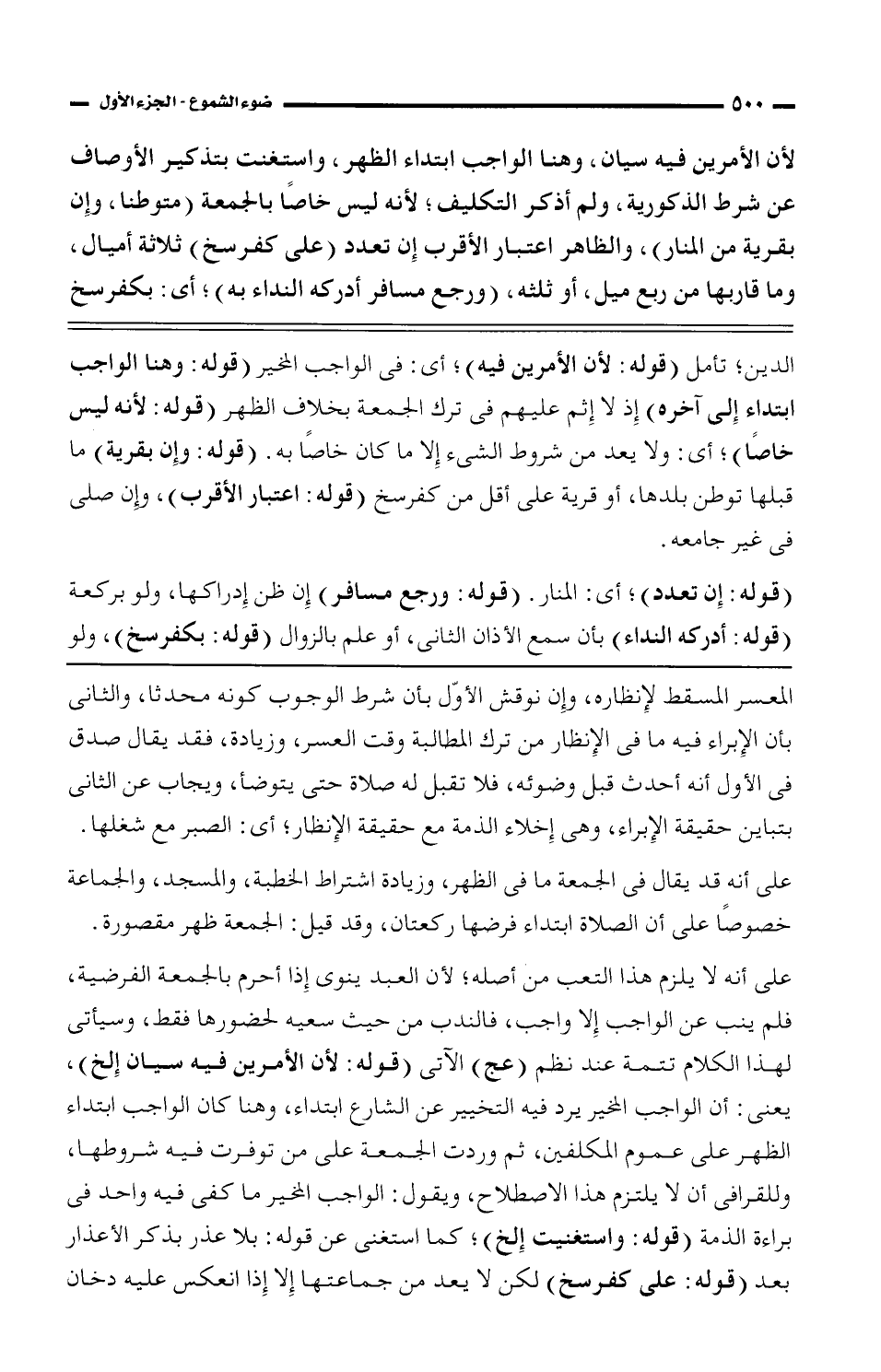 لأن الأمرين فيه سيان، وهنا الواجب ابتداء الظهر، واستغنت بتذكير الأوصاف عن شرط الذكورية، ولم أذكر التكليف؛ لأنه ليس خاصًا بالجمعة (متوطنًا، وإن بقرية من المنار)، والظاهر اعتبار الأقرب إن تعدد (على كفرسخ) ثلاثة أميال، وما قاربها من ربع ميل، أو ثلثه، (ورجع مسافر أدركه النداء به)؛ أي: بكفرسخ