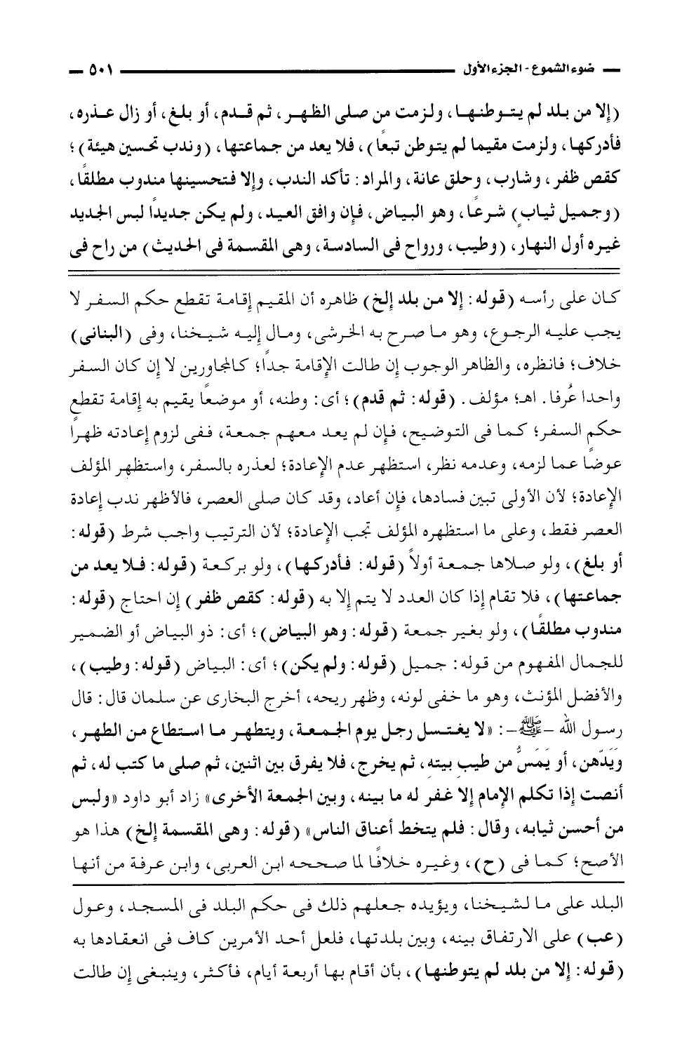 كان على رأسه (قوله: إلا من بلد إلخ) ظاهره أن المقيم إقامة تقطع حكم السفر لا يجب عليه الرجوع، وهو ما صرح به الخرشي، ومال إليه شيخنا، وفى (البناني) خلاف؛ فانظره، والظاهر الوجوب إن طالت الإقامة جدًا؛ كالمجاورين لا إن كان السفر واحدا عرفا. اهـ؛ مؤلف. (قوله: ثم قدم)؛ أي: وطنه، أو موضعًا يقيم به إقامة تقطع حكم السفر؛ كما فى التوضيح، فإن لم يعد معهم جمعة، ففى لزوم إعادته ظهرًا عوضًا عما لزمه، وعدمه نظر، استظهر عدم الإعادة؛ لعذره بالسفر، واستظهر المؤلف الإعادة؛ لأن الأولى تبين فسادها، فإن أعاد، وقد كان صلى العصر، فالأظهر ندب إعادة العصر فقط، وعلى ما استظهره المؤلف تجب الإعادة؛ لأن الترتيب واجب شرط (قوله: أو بلغ)، ولو صلاها جمعة أولًا (قوله: فأدركها)، ولو بركعة (قوله: فلا يعد من جماعتها)، فلا تقام إذا كان العدد لا يتم إلا به (قوله: كقص ظفر) إن احتاج (قوله: مندوب مطلقًا)، ولو بغير جمعة (قوله: وهو البياض)؛ أي: ذو البياض أو الضمير للجمال المفهوم من قوله: جميل (قوله: ولم يكن)؛ أي: البياض (قوله: وطيب)، والأفضل المؤنث، وهو ما خفى لونه، وظهر ريحه، أخرج البخارى عن سلمان قال: قال رسول الله - صلى الله عليه وسلم -: "لا يغتسل رجل يوم الجمعة، ويتطهر ما استطاع من الطهر، ويدّهن، أو يمسُّ من طيب بيته، ثم يخرج، فلا يفرق بين اثنين، ثم صلى ما كتب له، ثم أنصت إذا تكلم الإمام إلا غفر له ما بينه، وبين الجمعة الأخرى" زاد أبو داود "ولبس من أحسن ثيابه، وقال: فلم يتخط أعناق الناس" (قوله: وهى المقسمة إلخ) هذا هو الأصح؛ كما فى (ح)، وغيره خلافًا لما صححه ابن العربي، وابن عرفة من أنها