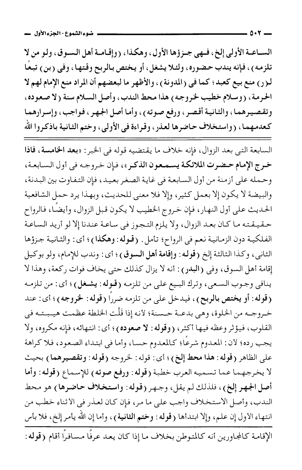السابعة التى بعد الزوال، فإنه خلاف ما يقتضيه قوله فى الخبر: "بعد الخامسة، فإذا خرج الإمام حضرت الملائكة يسمعون الذكر"، فإن خروجه فى أول السابعة، وحمله على أزمنة من أول السابعة فى غاية الصغر بعيد، فإن التفاوت بين البدنة، والبيضة لا يكون إلا بعمل كثير، وإلا فلا معنى للحديث، وبهذا يرد حمل الشافعية الحديث على أول النهار، فإن خروج الخطيب لا يكون قبل الزوال، وأيضًا، فالرواح حقيقته ما كان بعد الزوال، ولا يلزم التجوز فى ساعة عندنا إلا لو أريد الساعة الفلكية دون الزمانية نعم فى الرواح؛ تأمل. (قوله: وهكذا)؛ أي: والثانية جزؤها الثاني، وكذا الثالثة إلخ (قوله: وإقامة أهل السوق)؛ أي: وندب للإمام، ولو بوكيل إقامة أهل السوق، وفى (البدر): أنه لا يزال كذلك حتى يخاف فوات ركعة، وهذا لا ينافى وجوب السعي، وترك البيع على ما تلزمه (قوله: يشغل)؛ أي: من تلزمه (قوله: أو يختص بالربح)، فيدخل على من تلزمه ضررًا (قوله: لخروجه)؛ أي: عند خروجه من الخلوة، وهى بدعة حسنة؛ لأنه إذا قلَّت الخطة عظمت هيبته فى القلوب، فيؤثر وعظه فيها أكثر، (قووله: لا صعوده)؛ أي: انتهائه، فإنه مكروه، ولا يجب رده؛ لأن: المعدوم شرعًا؛ كالمعدوم حسا، وأما فى ابتداء الصعود، فلا كراهة على الظاهر (قوله: هذا محط إلخ)؛ أي: قوله: لخروجه (قوله: وتقصيرهما) بحيث لا يخرجهما عما تسميه العرب خطبة (قوله: ورفع صوته) للإسماع (قوله: وأما أصل الجهر إلخ)، فلذلك لم يقل، وجهر (قوله: واستخلاف حاضرها) هو محط الندب، وأصل الاستخلاف واجب على ما مر، فإن كان لعذر فى الأثناء خطب من انتهاء الأول إن علم، وإلا ابتدأها (قوله: وختم الثانية)، وأما إن الله يأمر إلخ، فلا بأس
