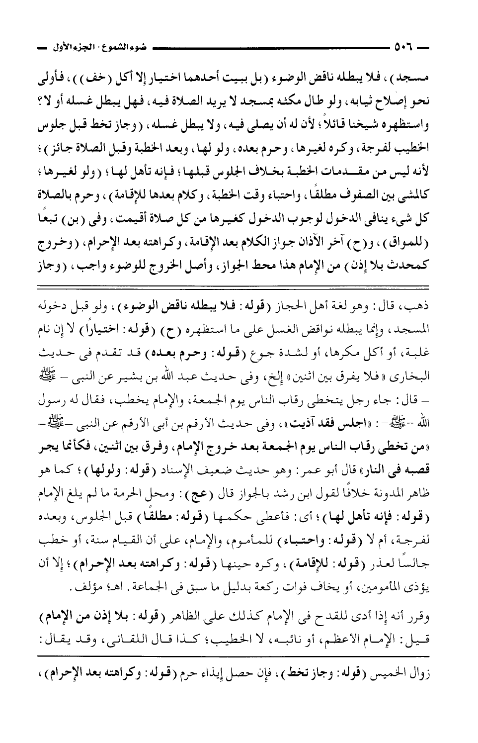 ذهب، قال: وهو لغة أهل الحجاز (قوله: فلا يبطله ناقض الوضوء)، ولو قبل دخوله المسجد، وإنما يبطله نواقض الغسل على ما استظهره (ح) (قوله: اختيارًا) لا إن نام غلبة، أو أكل مكرها، أو لشدة جوع (قوله: وحرم بعده) قد تقدم فى حديث البخارى "فلا يفرق بين اثنين" إلخ، وفى حديث عبد الله بن بشير عن النبى - صلى الله عليه وسلم - قال: جاء رجل يتخطى رقاب الناس يوم الجمعة، والإمام يخطب، فقال له رسول الله - صلى الله عليه وسلم -: "اجلس فقد آذيت"، وفى حديث الأرقم بن أبى الأرقم عن النبى - صلى الله عليه وسلم - "من تخطى رقاب الناس يوم الجمعة بعد خروج الإمام، وفرق بين اثنين، فكأنما يجر قصبه فى النار" قال أبو عمر: وهو حديث ضعيف الإسناد (قوله: ولولها)؛ كما هو ظاهر المدونة خلافًا لقول ابن رشد بالجواز قال (عج): ومحل الحرمة ما لم يبلغ الإمام (قوله: فإنه تأهل لها)؛ أي: فأعطى حكمها (قوله: مطلقًا) قبل الجلوس، وبعده لفرجة، أم لا (قوله: واحتباء) للمأموم، والإمام، على أن القيام سنة، أو خطب جالسًا لعذر (قوله: للإقامة)، وكره حينها (قوله: وكراهته بعد الإحرام)؛ إلا أن يؤذى المأمومين، أو يخاف فوات ركعة بدليل ما سبق فى الجماعة. اهـ؛ مؤلف.