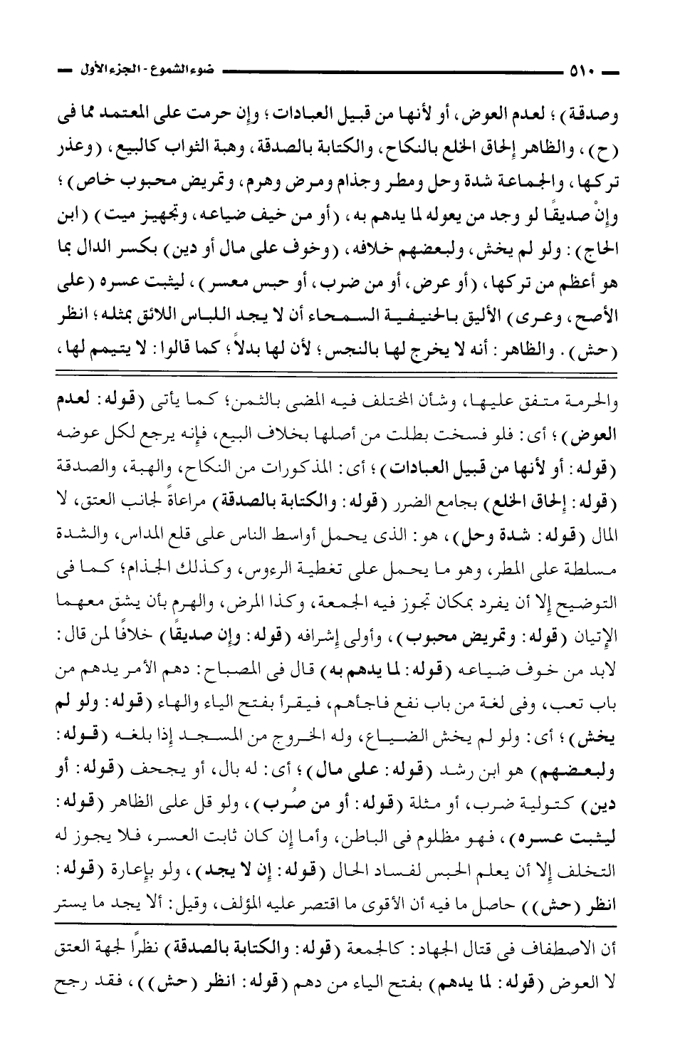 والحرمة متفق عليها، وشأن المختلف فيه المضى بالثمن؛ كما يأتى (قوله: لعدم العوض)؛ أي: فلو فسخت بطلت من أصلها بخلاف البيع، فإنه يرجع لكل عوضه (قوله: أو لأنها من قبيل العبادات)؛ أي: المذكورات من النكاح، والهبة، والصدقة (قوله: إلحاق الخلع) بجامع الضرر (قوله: والكتابة بالصدقة) مراعاةً لجانب العتق، لا المال (قوله: شدة وحل)، هو: الذى يحمل أواسط الناس على قلع المداس، والشدة مسلطة على المطر، وهو ما يحمل على تغطية الرءوس، وكذلك الجذام؛ كما فى التوضيح إلا أن يفرد بمكان تجوز فيه الجمعة، وكذا المرض، والهرم بأن يشق معهما الإتيان (قوله: وتمريض محبوب)، وأولى إشرافه (قوله: وإن صديقًا) خلافًا لمن قال: لابد من خوف ضياعه (قوله: لما يدهم به) قال فى المصباح: دهم الأمر يدهم من باب تعب، وفى لغة من باب نفع فاجأهم، فيقرأ بفتح الياء والهاء (قوله: ولو لم يخش)؛ أي: ولو لم يخش الضياع، وله الخروج من المسجد إذا بلغه (قوله: ولبعضهم) هو ابن رشد (قوله: على مال)؛ أي: له بال، أو يجحف (قوله: أو دين) كتولية ضرب، أو مثلة (قوله: أو من صرب)، ولو قل على الظاهر (قوله: ليثبت عسره)، فهو مظلوم فى الباطن، وأما إن كان ثابت العسر، فلا يجوز له التخلف إلا أن يعلم الحبس لفساد الحال (قوله: إن لا يجد)، ولو بإعارة (قوله: انظر (حش)) حاصل ما فيه أن الأقوى ما اقتصر عليه المؤلف، وقيل: ألا يجد ما يستر