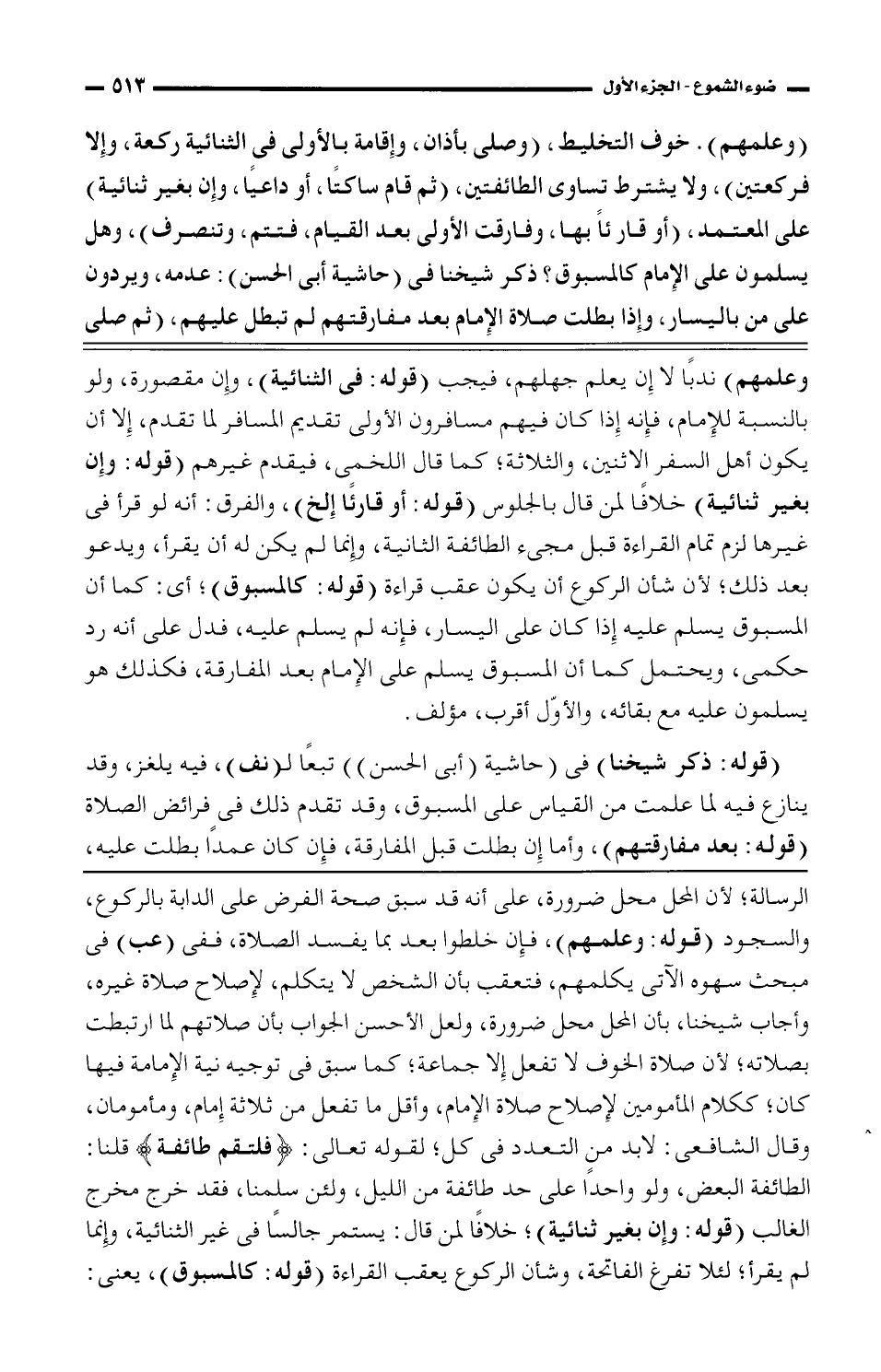 الرسالة؛ لأن المحل محل ضرورة، على أنه قد سبق صحة الفرض على الدابة بالركوع، والسجود (قوله: وعلمهم)، فإن خلطوا بعد بما يفسد الصلاة، ففى (عب) فى مبحث سهوه الآتى يكلمهم، فتعقب بأن الشخص لا يتكلم، لإصلاح صلاة غيره، وأجاب شيخنا، بأن المحل محل ضرورة، ولعل الأحسن الجواب بأن صلاتهم لما ارتبطت بصلاته؛ لأن صلاة الخوف لا تفعل إلا جماعة؛ كما سبق فى توجيه نية الإمامة فيها كان؛ كلام المأمومين لإصلاح صلاة الإمام، وأقل ما تفعل من ثلاثة إمام، ومأمومان، وقال الشافعي: لابد من التعدد فى كل؛ لقوله تعالى: {فلتقم طائفة} قلنا: الطائفة البعض، ولو واحدًا على حـ طائفة من الليل، ولئن سلمنا، فقد خرج مخرج الغالب (قوله: وإن بغير ثنائية)؛ خلافًا لمن قال: يستمر جالسًا فى غير الثنائية، وإنما لم يقرأ؛ لئلا تفرغ الفاتحة، وشأن الركوع يعقب القراءة (قوله: كالمسبوق)، يعني: